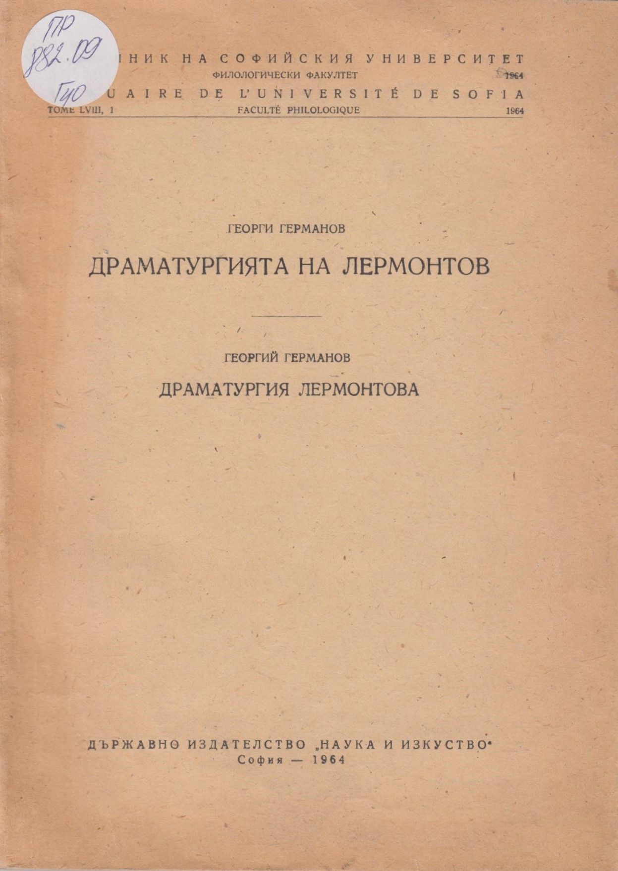 Германов, Георги. Драматургията на Лермонтов / Георги Д. Германов. - София : Наука и изкуство, 1964. - 223 с. ; 24 см. * Заб. Самостоятелно книжно тяло, на корицата са отпечатани данни за Годишник на СУ "Св. К. Охридски", Т. LVII (58), на Филологически факултет (отпечатък)