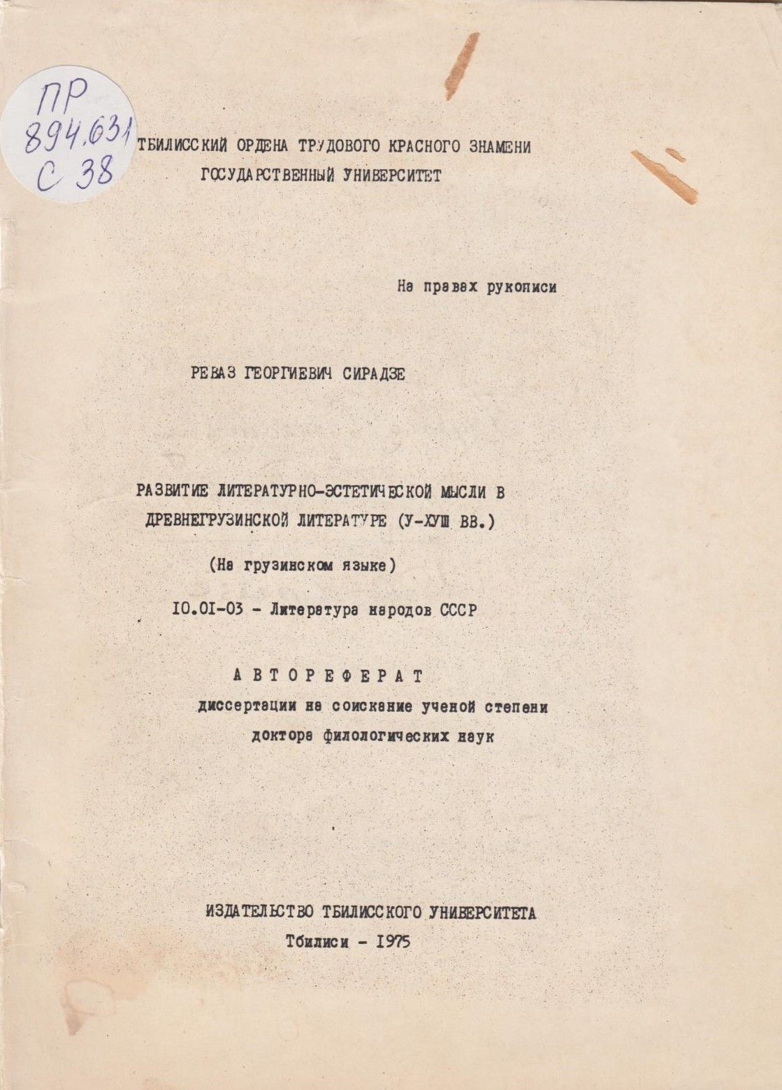 Сирадзе, Реваз. Развитие литературно-эстетической мысли в древнегрузинской литературе (V-VХIII вв.) : Автореферат диссертации на соискание ученой степени доктора филолог. наук / Реваз Георгиевич Сирадзе . - Тбилиси : Изд. Тбилиского унив., 1975 . - 56 с. ; 21 см