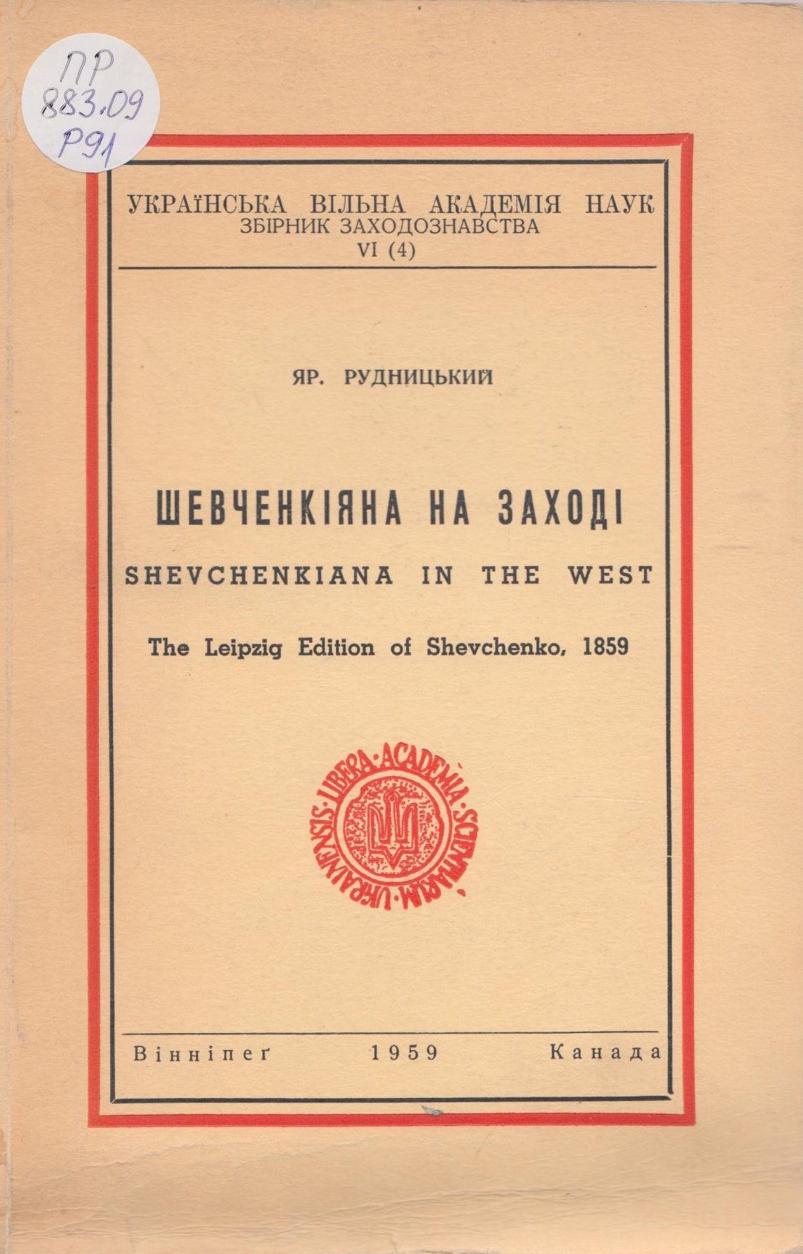 Рудницький, Я. Шевченкiяна на заходi. Перше видання Шевченка на заходi : З нагоди сторiччя 1859-1959 / Яр. Рудницький . - Вiннiпег : б.изд., 1959 . - 5-80 с. ; 22 см