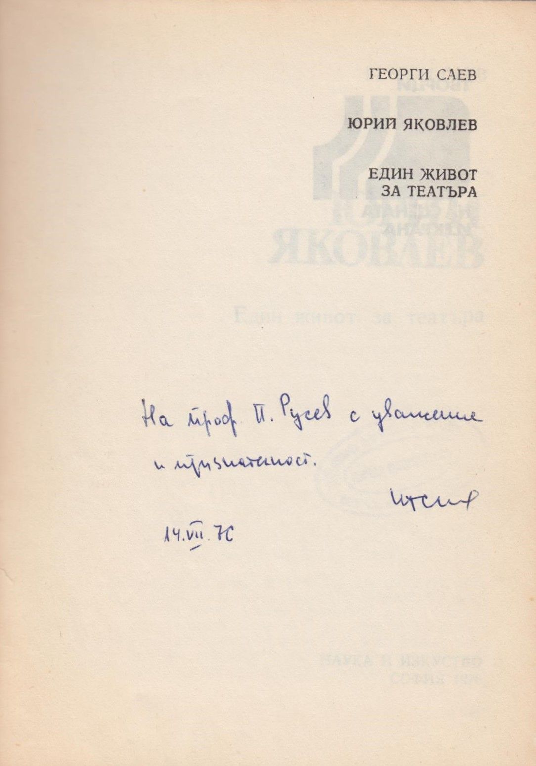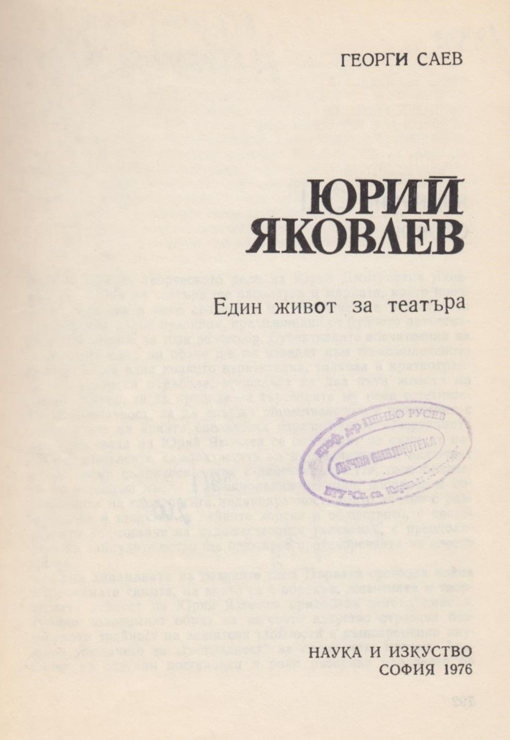 Саев, Георги. Юрий Яковлев : Един живот за театъра / Георги Саев. - София : Наука и изкуство, 1976. - 84 с., 8 л. портр. и факс. ; 20 см.
