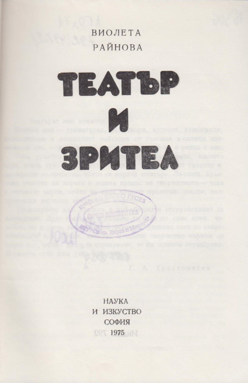Райнова, Виолета. Театър и зрител : [Научно-популярен очерк] / Виолета Райнова. - София : Наука и изкуство, 1975. - 87 с. ; 20 см.