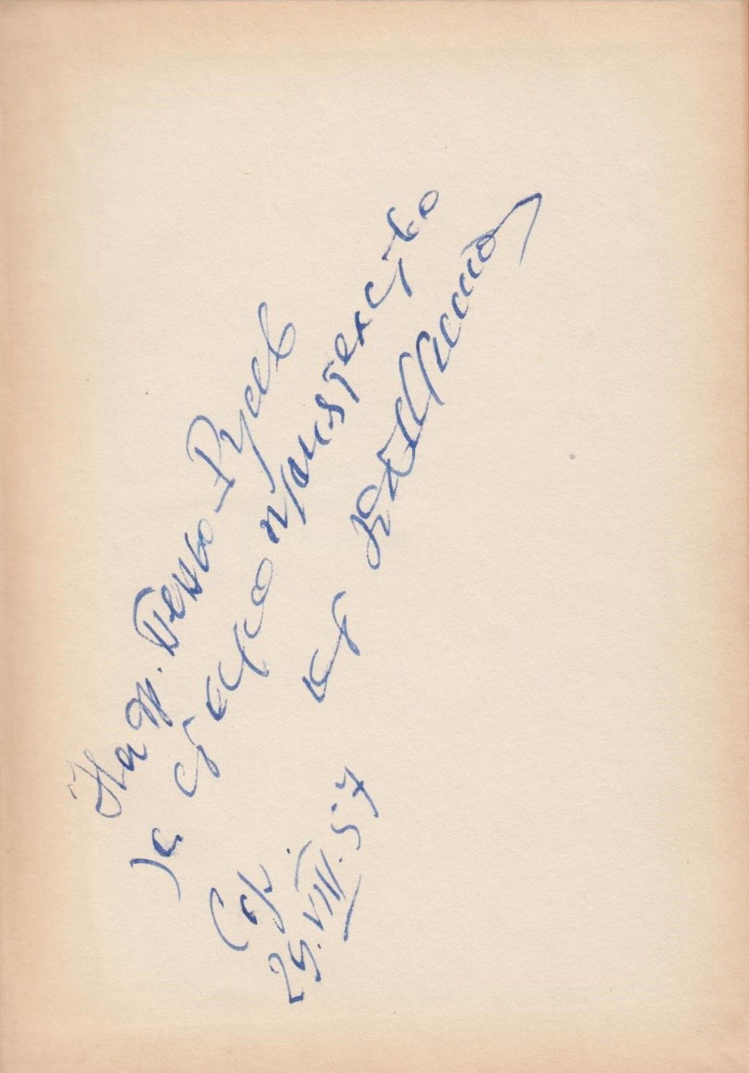 Описание : Автограф на бълг. език: На Пеньо Русев за старо приятелство, Сф - 29.08.1957 г.