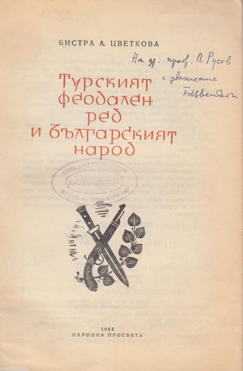 Цветкова, Бистра. Турският феодален ред и българският народ / Бистра А. Цветкова ; [Ред. Димитър С. Ангелов]. - [София] : Нар. просв., 1962. - 80 с. : с ил. ; 25 см.