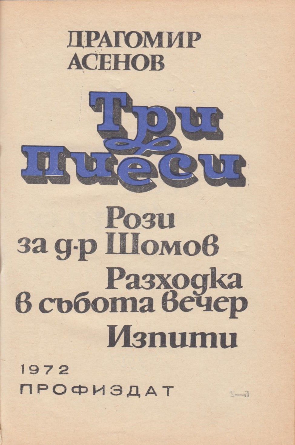 Асенов, Драгомир. Три пиеси : Рози за д-р Шомов. Разходка в събота вечер. Изпити / Драгомир Асенов . - С. : Профиздат, 1972 . - 224 с.