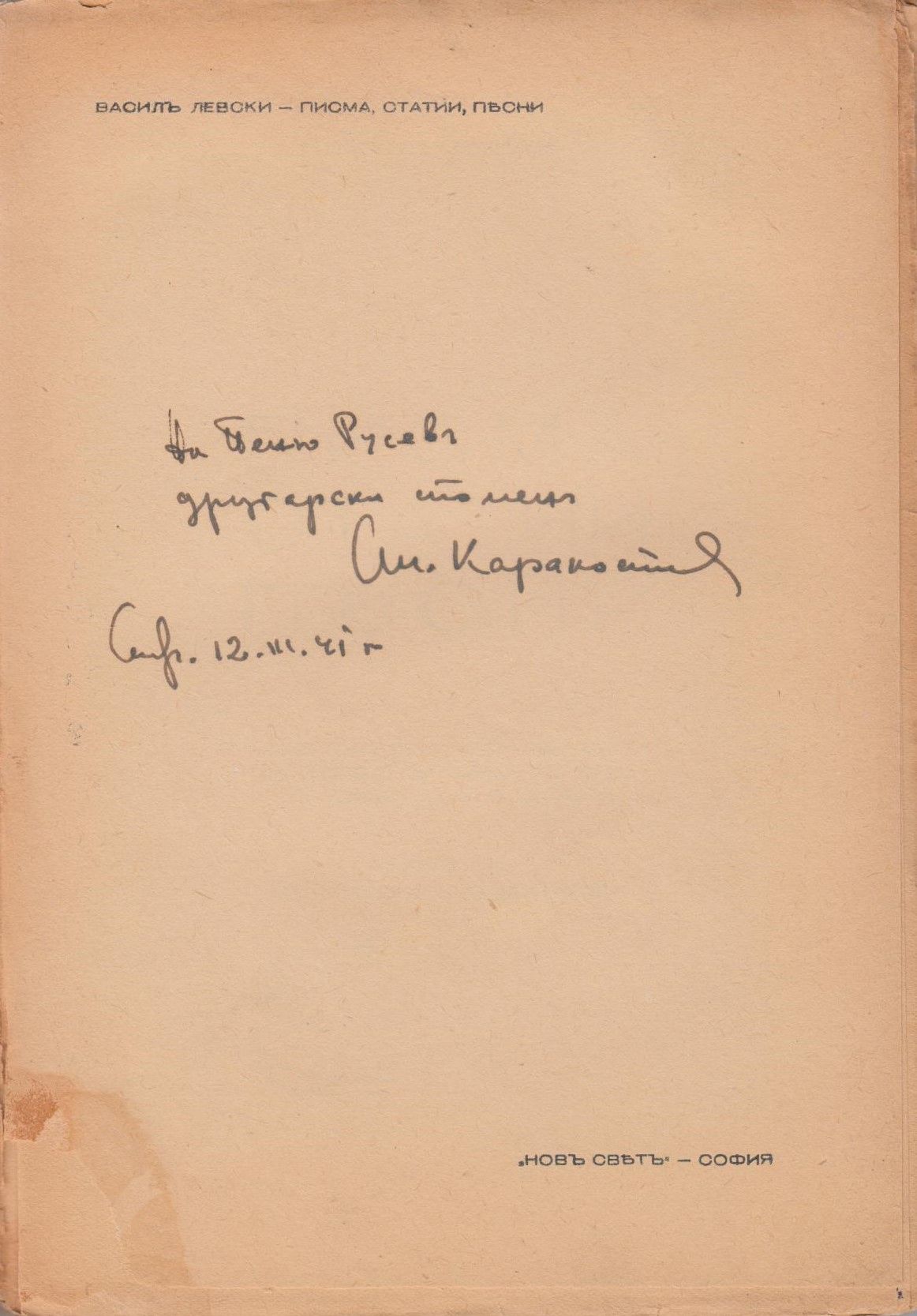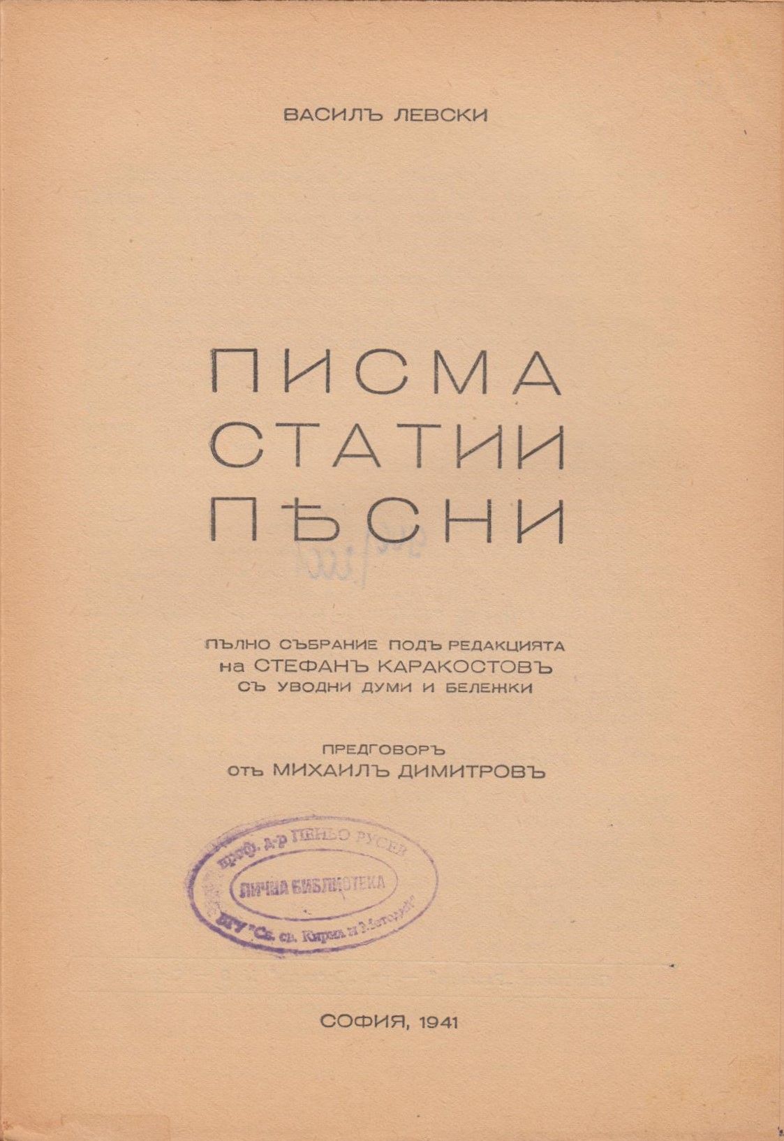 Левски, Васил. Писма, статии, песни : Пълно събрание / Васил Левски ; Под ред. на Стефан Каракостов с уводни думи и бел. ; Предг. от Михаил Димитров. - София : Нов свят, 1941. - 207 с. : с факс. ; 25 см