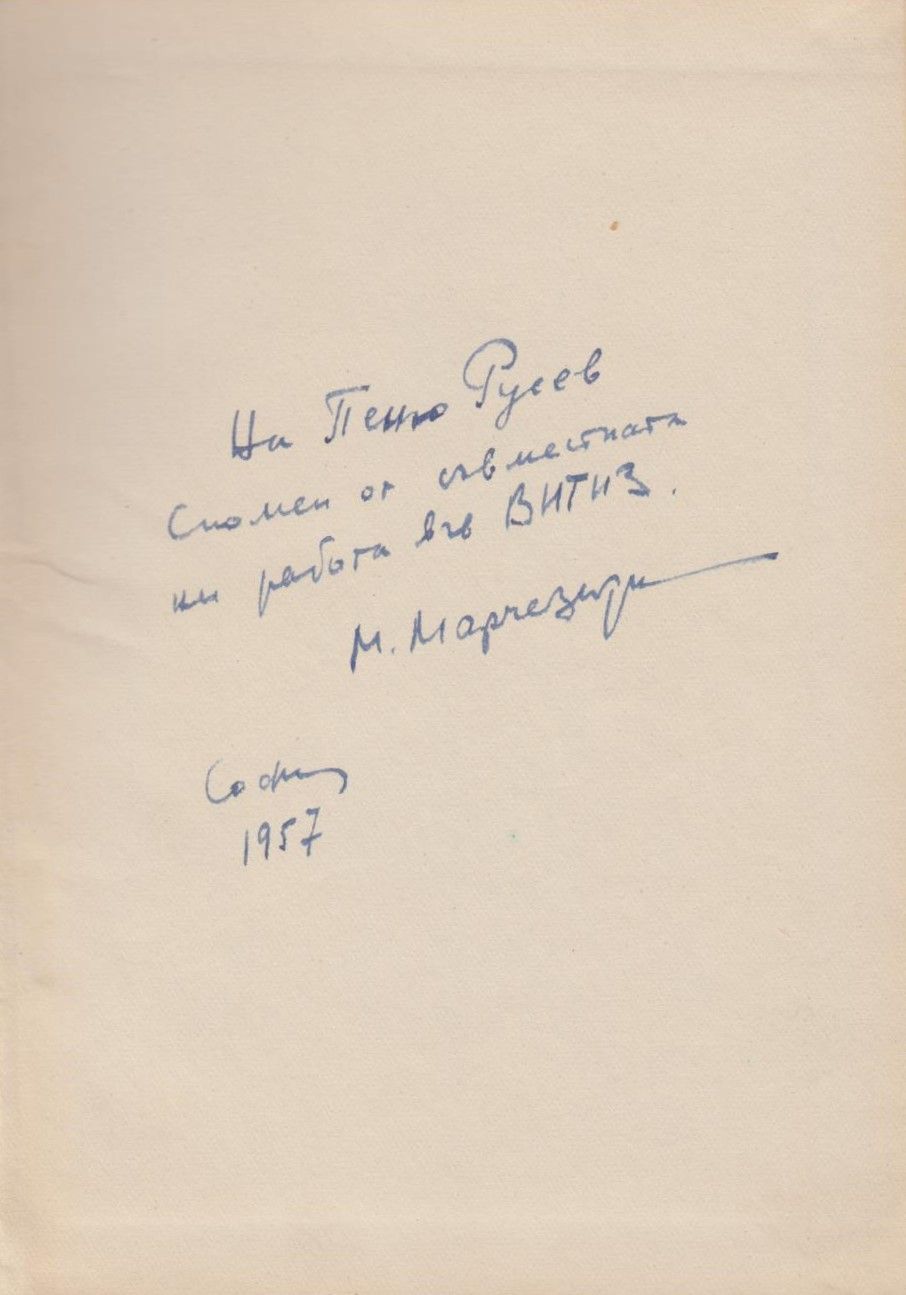 Описание : Автограф на бълг. език: На Пеньо Русев, спомен от съвместната ни работа във ВИТИЗ, София, 1957 г.