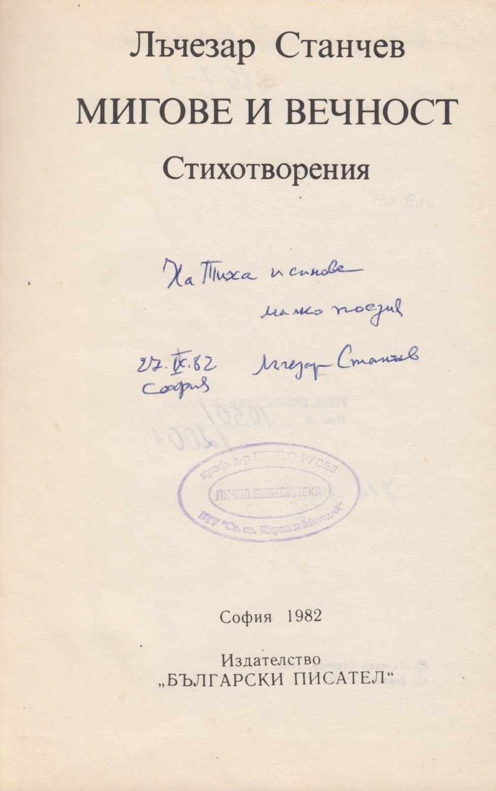 Станчев, Лъчезар. Мигове и вечност : Стихотворения / Лъчезар Станчев. - София : Бълг. писател, 1982. - 112 с. ; 21 см.