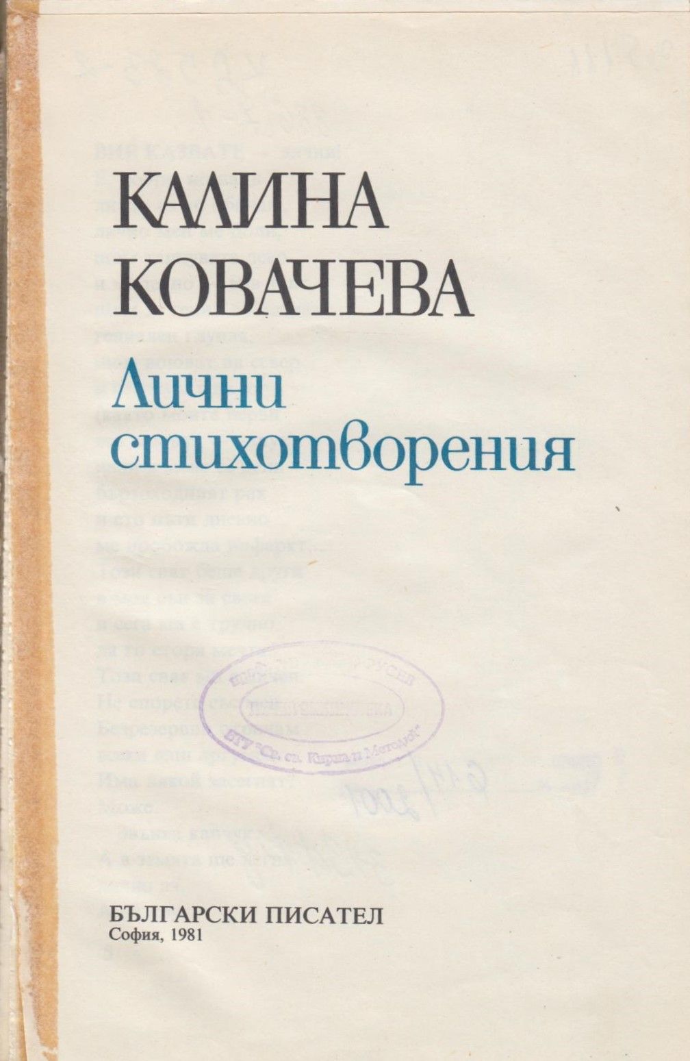 Ковачева, Калина. Лични стихотворения / Калина Ковачева. - София : Бълг. писател, 1981. - 52 с. ; 21 см.