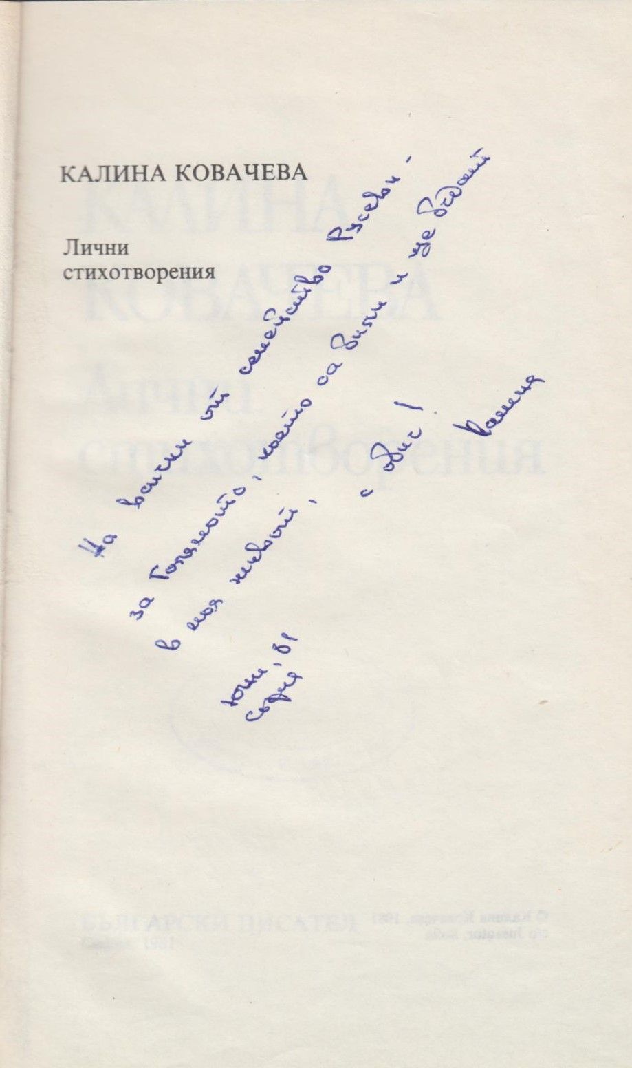Описание : Автограф на бълг. език: На всички от семейство Русеви – за Голямото, което са били и ще бъдат в моя живот, с обич! юни, 1981 г., София