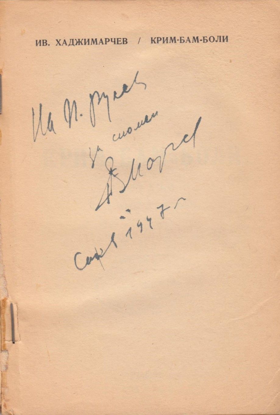 Хаджимарчев, Иван. Крим-бам-боли : Разкази за малки и големи / Иван Хаджимарчев ; Ил. Вл. Коренев. – София: Изд. авт., 1947. - 144 с. : с ил. ; 18 см.