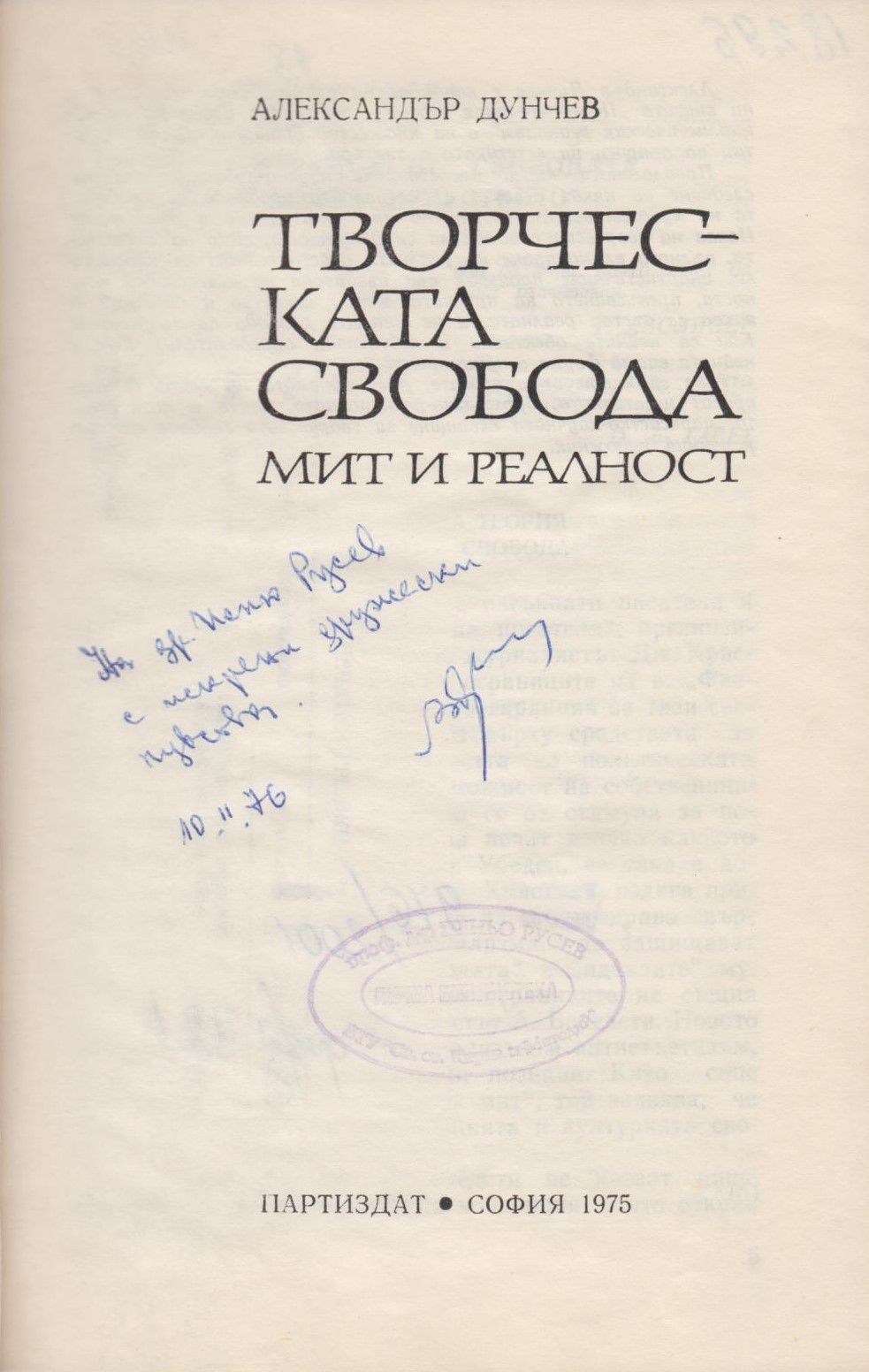 Дунчев, Александър А. Творческата свобода : Мит и реалност / Александър Дунчев. - София : Партиздат, 1975. - 191 с. ; 21 см.