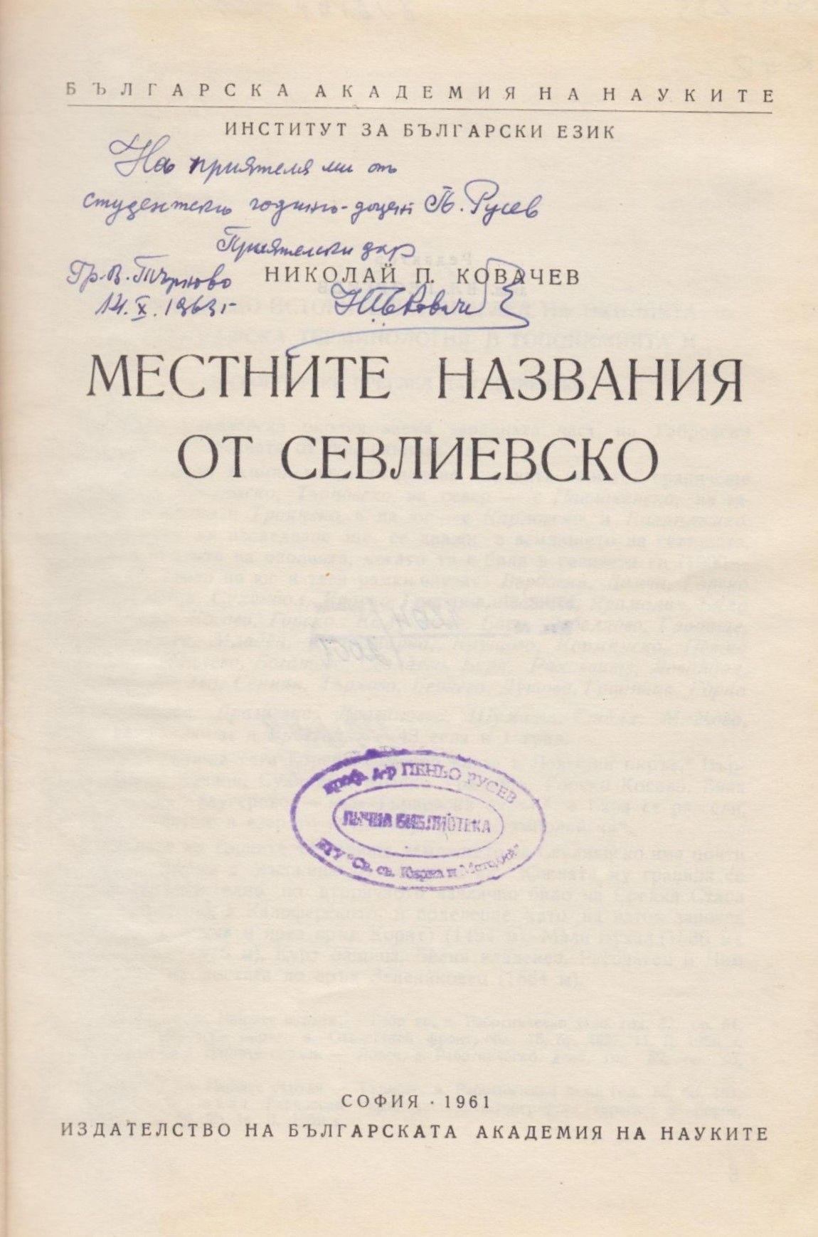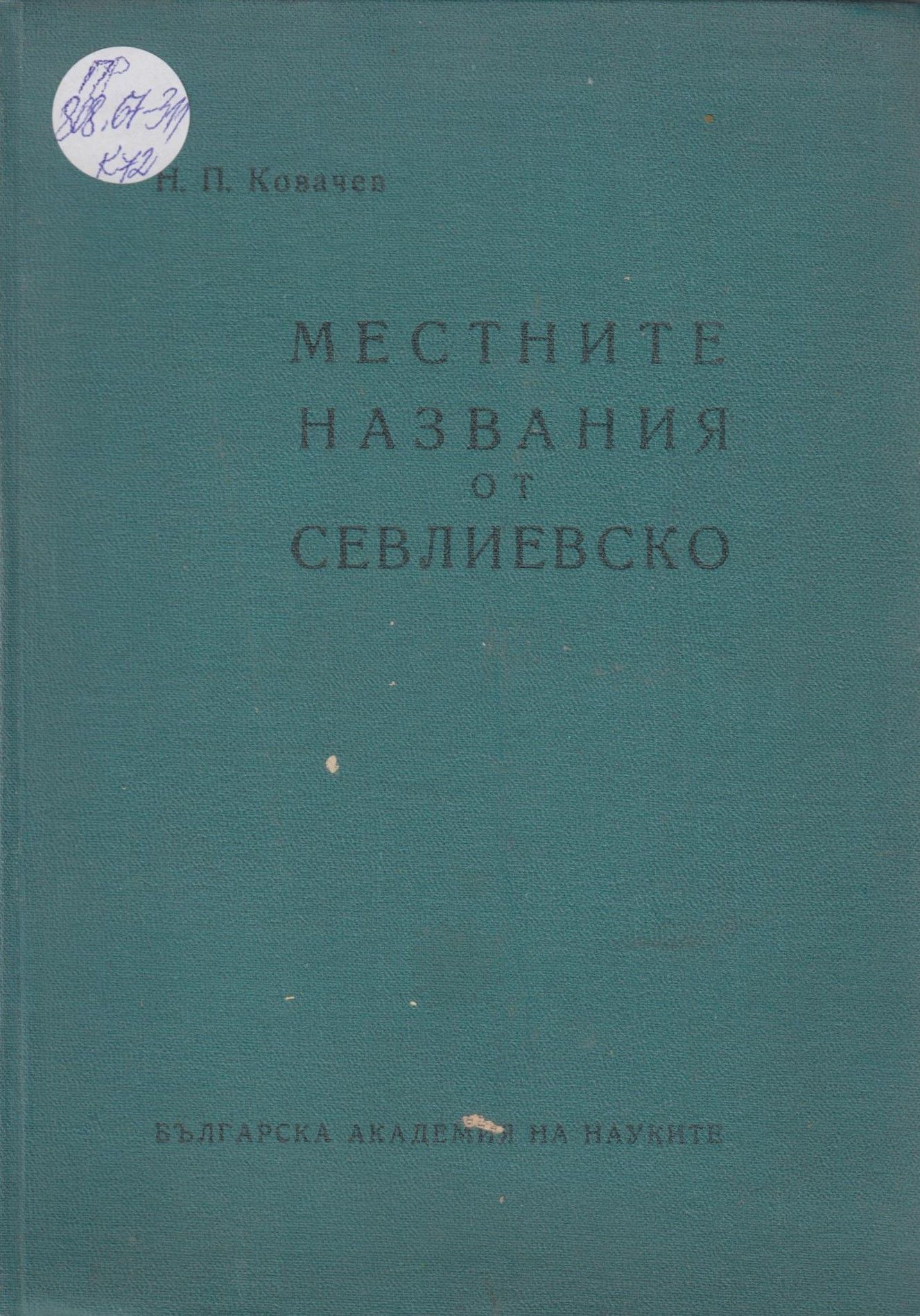 Ковачев, Николай. Местните названия в Севлиевско / Николай П. Ковачев ; Отг. ред. Владимир Георгиев. - София : БАН, 1961. - 300 с. ; 25 см.