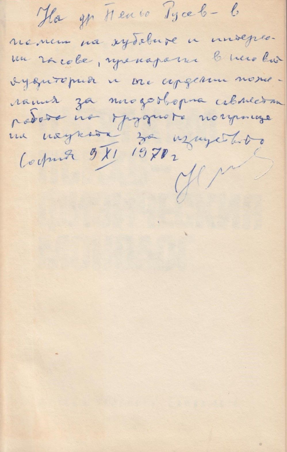 Описание : Автограф на бълг. език: На др. Пеньо Русев – в памет на хубавите и интересни часове прекарани в неговата аудитория и все сърдечни пожелания за плодотворна съвместна работа по трудното поприще на науката и изкуството, София, 09.11.1970 г.