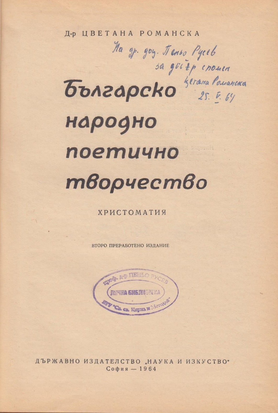 Романска, Цветана Стоянова. Българско народно поетично творчество : Христоматия / Цветана Романска. - София : Наука и изкуство, 1964. - 248 с. ; 24 см.