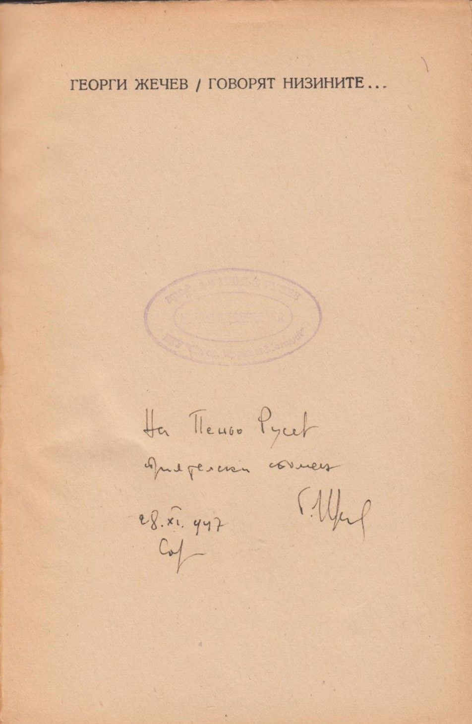 Жечев, Георги. Говорят низините : Стихове / Георги Жечев. - София : Изд. авт., 1947. - 104 с. ; 25 см.