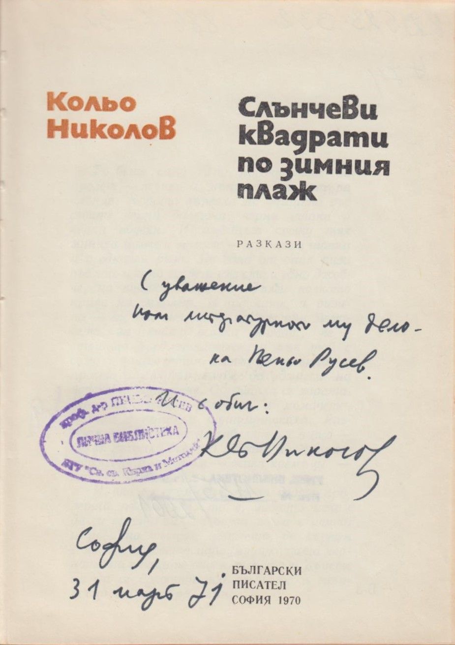 Николов, Кольо. Слънчеви квадрати по зимния плаж : Разкази / Кольо Николов. - София : Бълг. писател, 1970. - 147 с. ; 18 см.