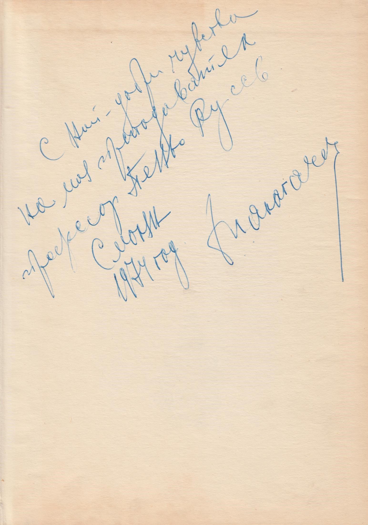 Описание : Автограф на бълг. език: С най-добри чувства на моя преподавател професор Пеньо Русев, Смолян, 1974 г.