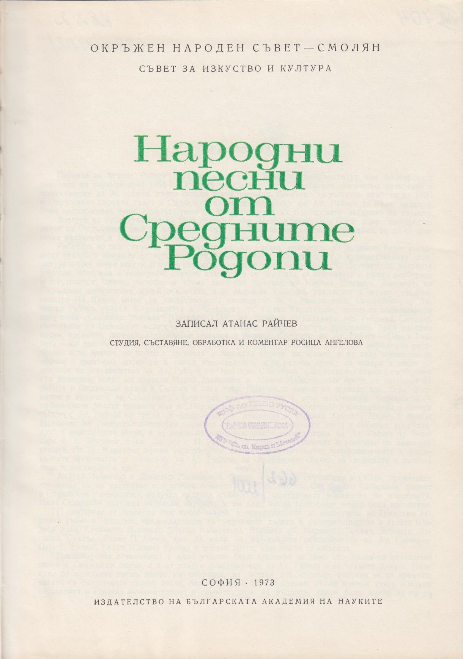 Народни песни от Средните Родопи : [Сборник] / Записал Атанас Райчев ; Студия, състав., обраб. и коментар Росица Ангелова. - София : БАН, 1973. - 652 с. : с портр. ; 29 см.