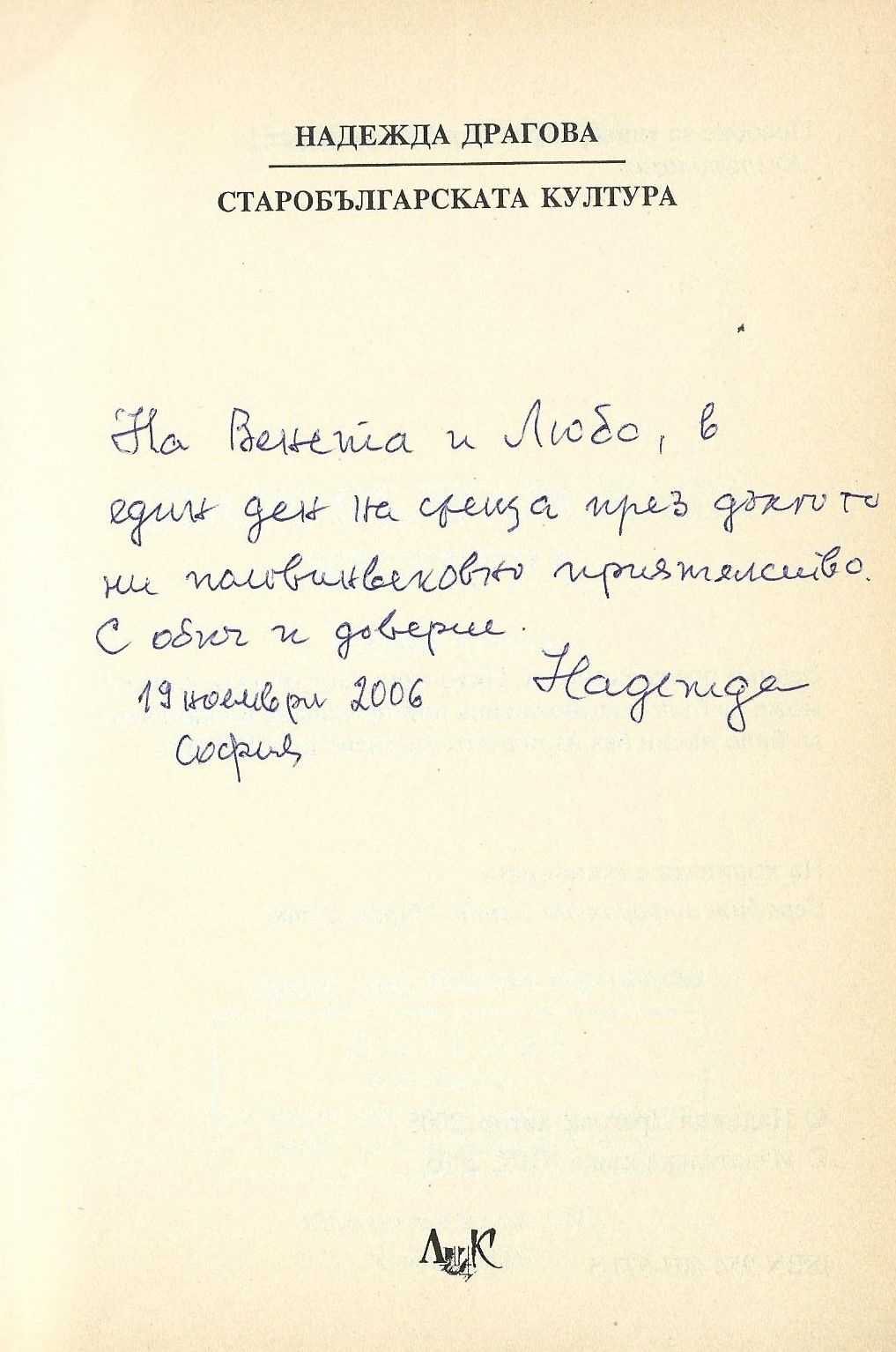 Описание : На Венета и Любо, в един ден на среща през дългото ни половинвековно приятелство. С обич и доверие. Надежда