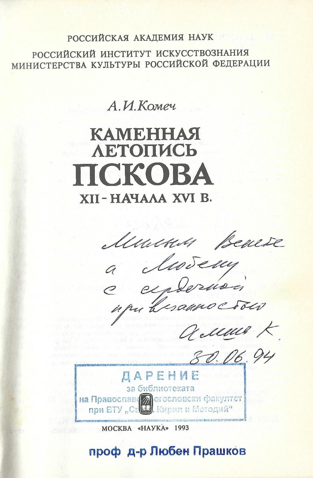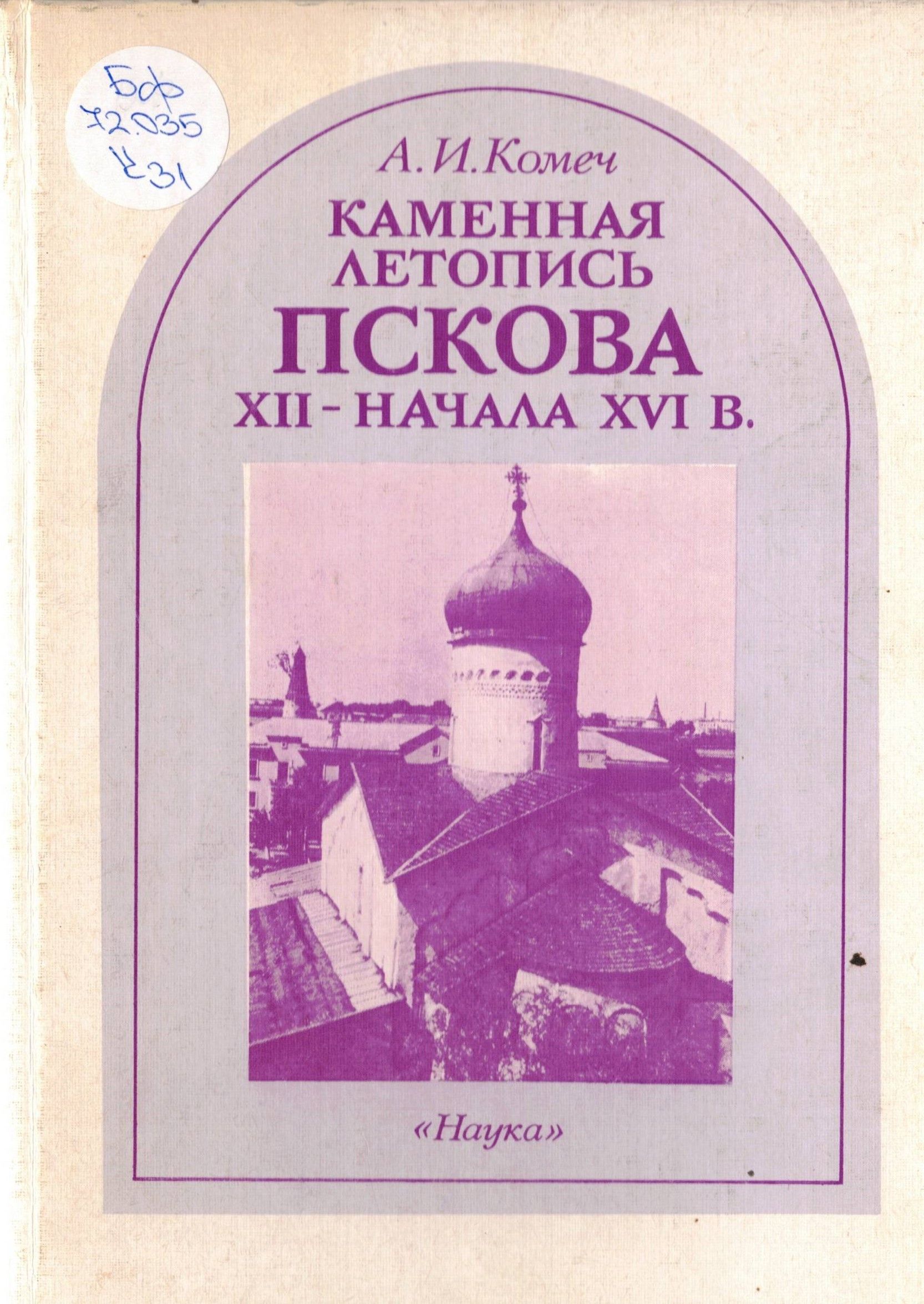 Комеч, Алексей. Заглавие Каменная летопись Пскова XII-начала XVI в. / А. И. Комеч. - Москва : Наука, 1993. - 256 с. : с ил. ; 21 см.