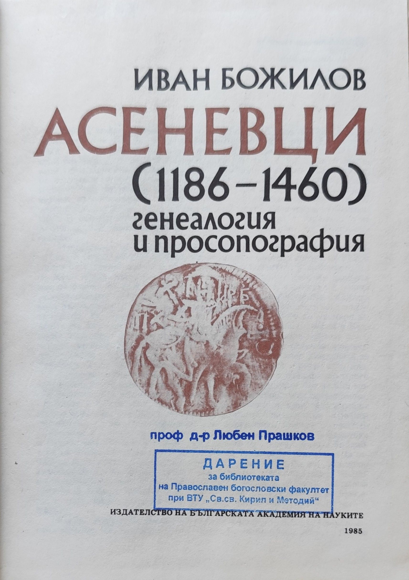 Божилов, Иван. Фамилията на Асеневци (1186 - 1460) : Генеалогия и просопография / Иван Божилов. - София : Акад. изд. "Проф. Марин Дринов ", 1994. - 508 с., 13 л. ил., сх., факс. ; 25 см.