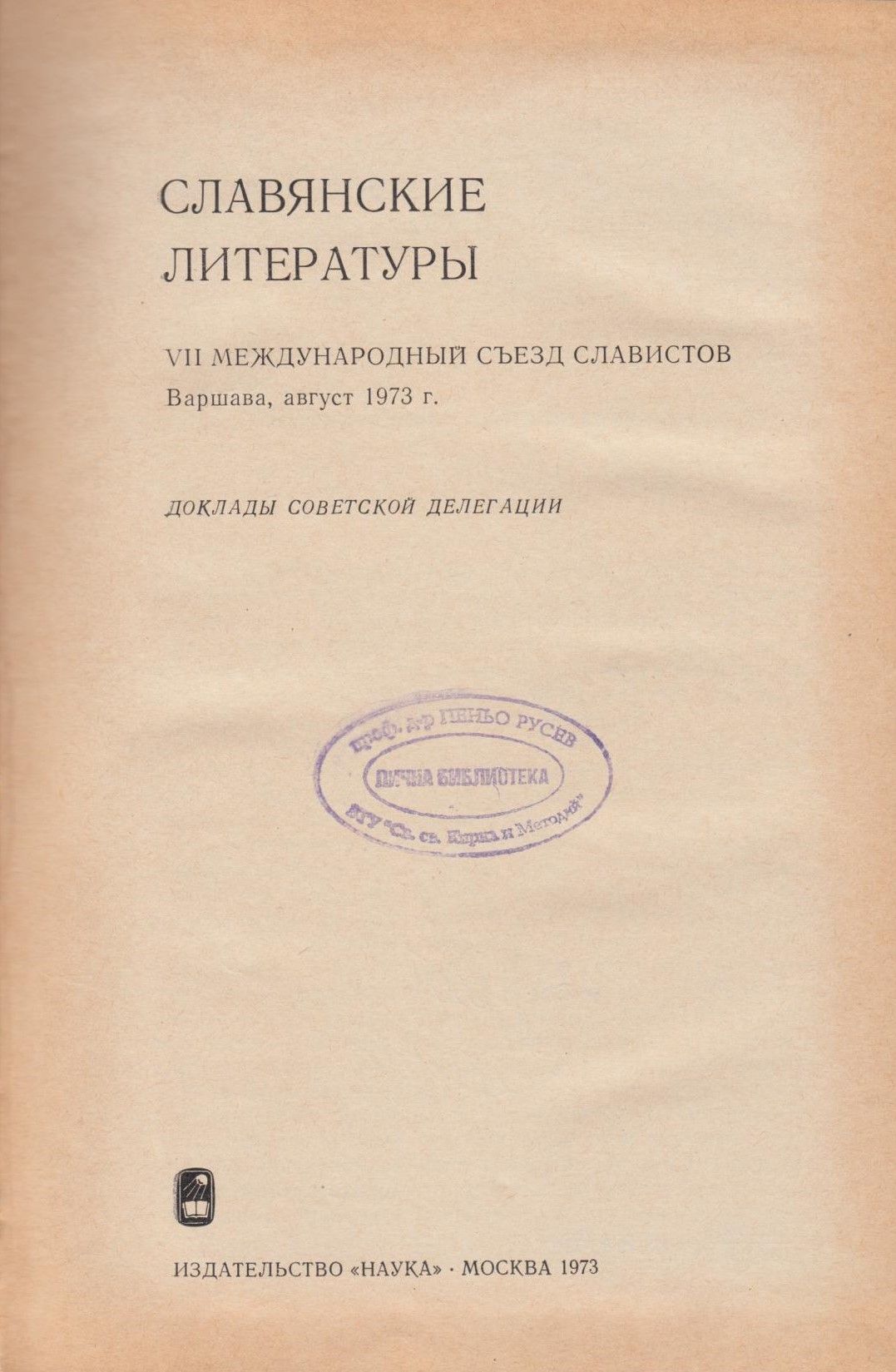 Славянские литературы : VII Междунар. съезд славистов. Варшава, авг. 1973 г. : Докл. сов. делегации / Ред. коллегия: акад. М. П. Алексеев [и др.] ; [АН СССР. Сов. ком. славистов]. – Москва : Наука, 1973. - 558 с. ; 22 см