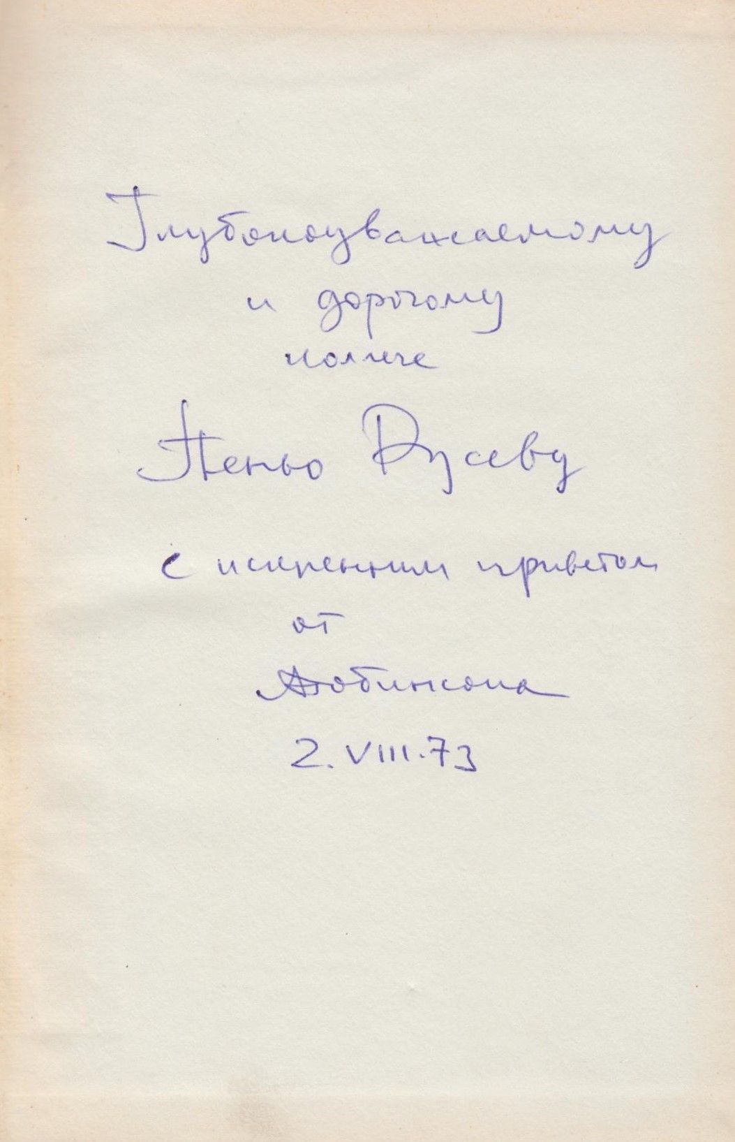Описание : Автограф на рус. ез.: Глубокоуважаемому и дорогому колеге Пеньо Русеву с искренимии приветом от АРобинсона. 2.VIII.73. * Дигиталният обект е предназначен само за лично ползване