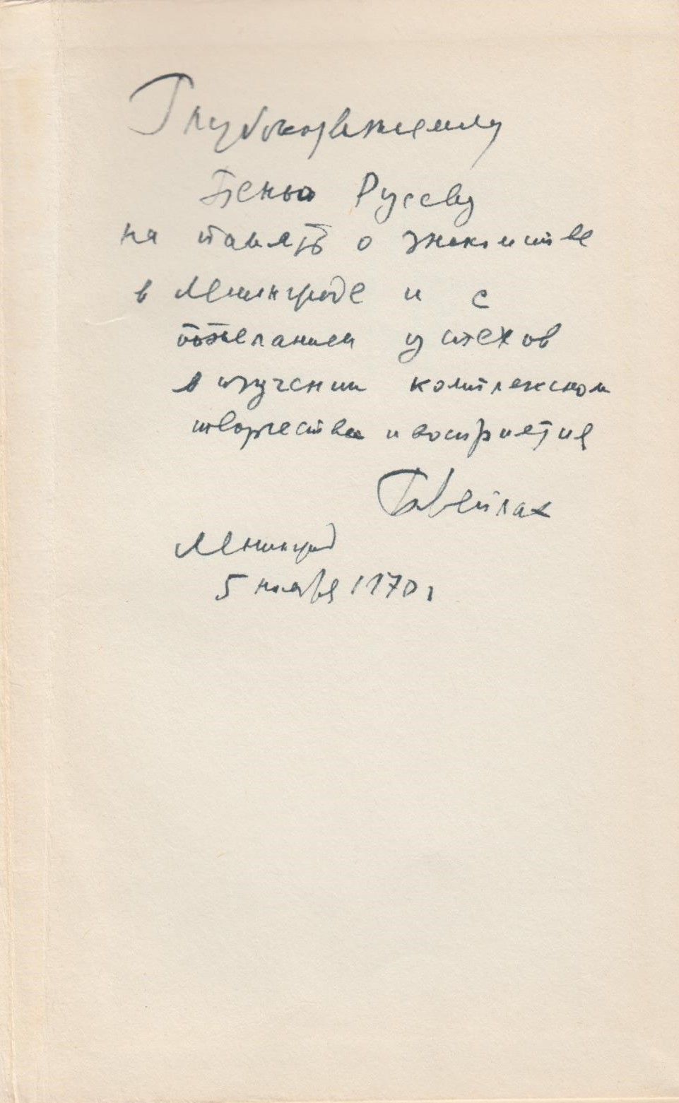 Описание : Автограф на рус. ез.: Глубокоуважаемому Пеньо Русеву, на память о знакомстве в Ленинграде и с пожеланием успехов в изучении комплексном творчество и восприятия.