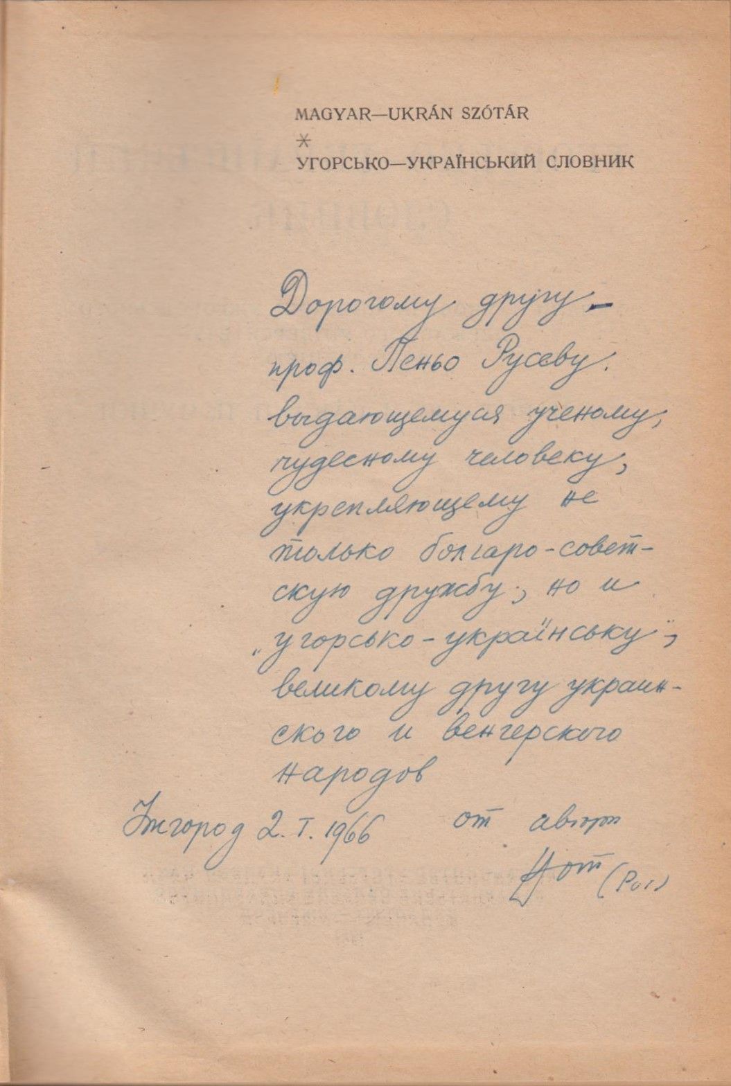 Описание : Дорогому другу проф. Пеньо Русеву, выдающемуся ученому, чудесному человеку, укрепляющему не только болгаро-советскую дружбу, но и „угорсько-украiнську“, великому другу украинского и венгерского народов. От автора(Рот). Ужгород. 2.I.1966