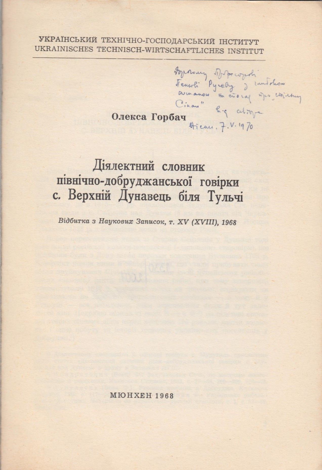 Горбач, О. Дiялектний словник пiвнiчно-добруджанськоi говiрки с. Верхнiй Дунавець бiля Тульчi : Вiдбидка з Наукових записок, т. XV(XVIII), 1968 / О. Горбач. – Мюнхен, 1968. – 44 с.
