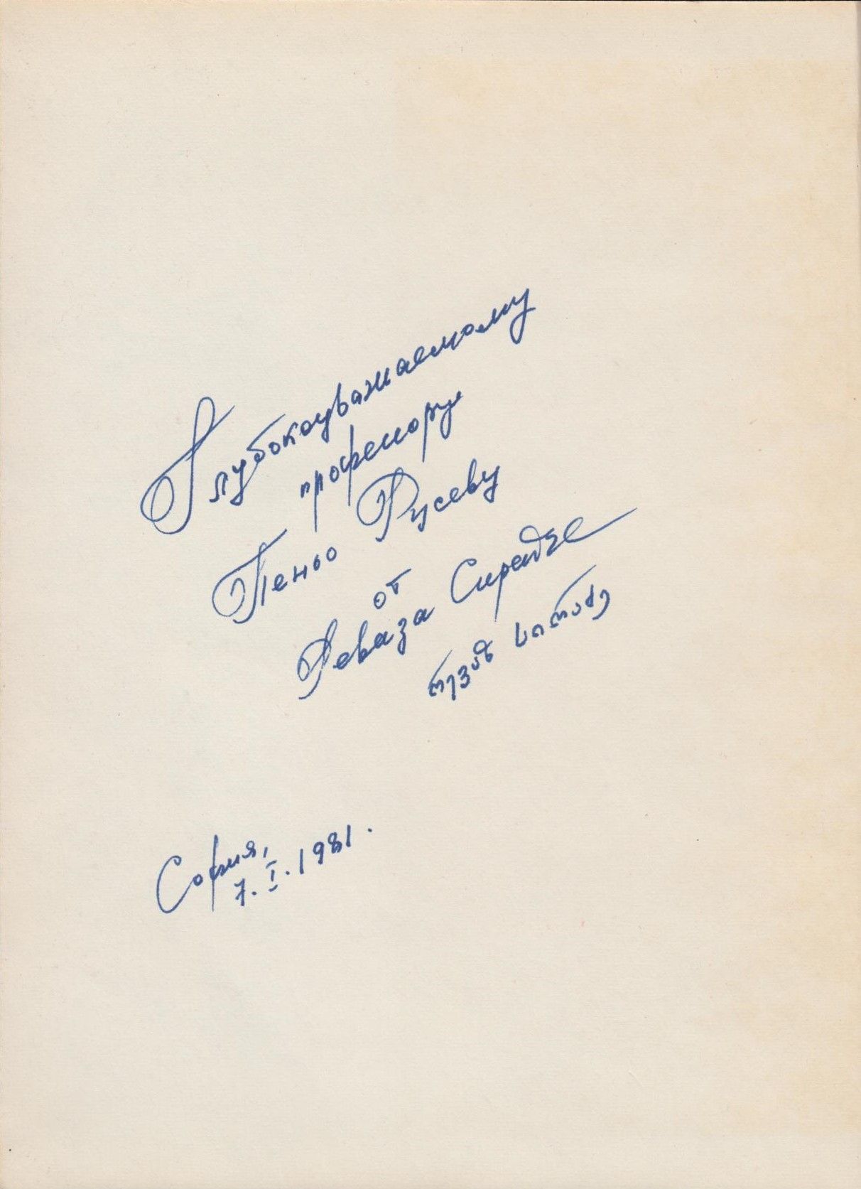 Описание : Глубокоуважаемому професору Пеньо Русеву от Реваза Сирадзе. София, 7.I.1981