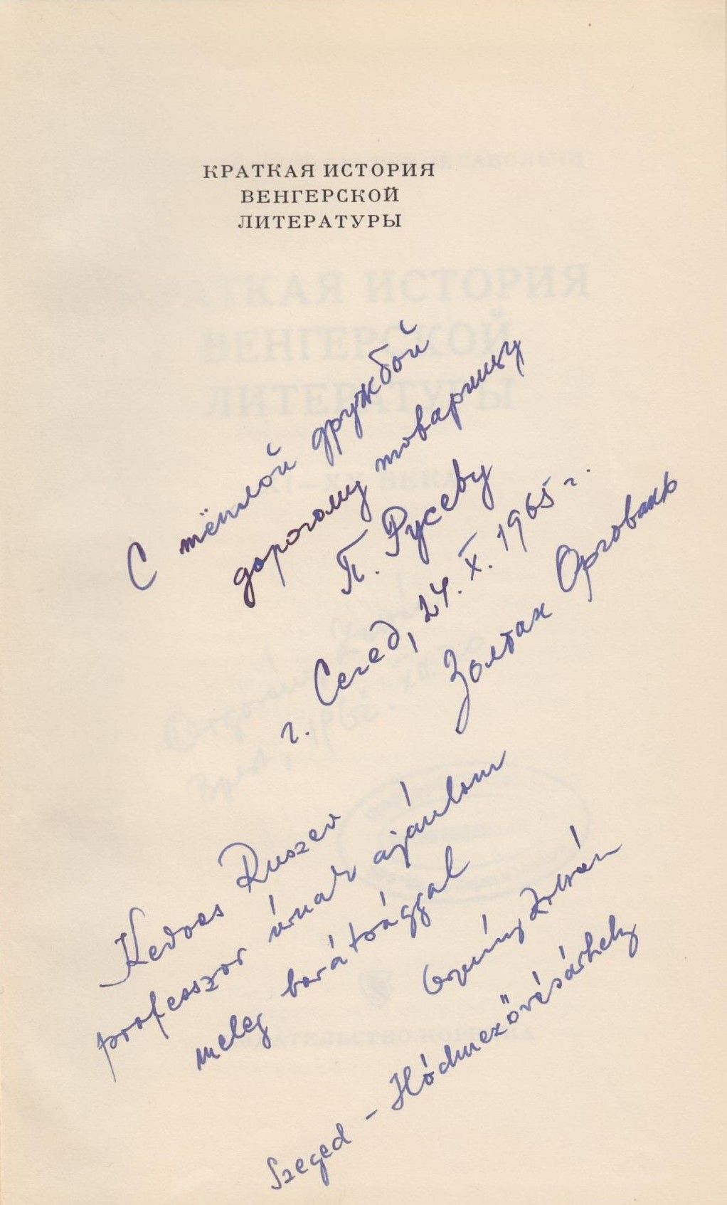 Описание : С теплой дружбой дорогому товарищу П. Русеву, г. Сегед, 24.X.1965 г., Золтан Оргован