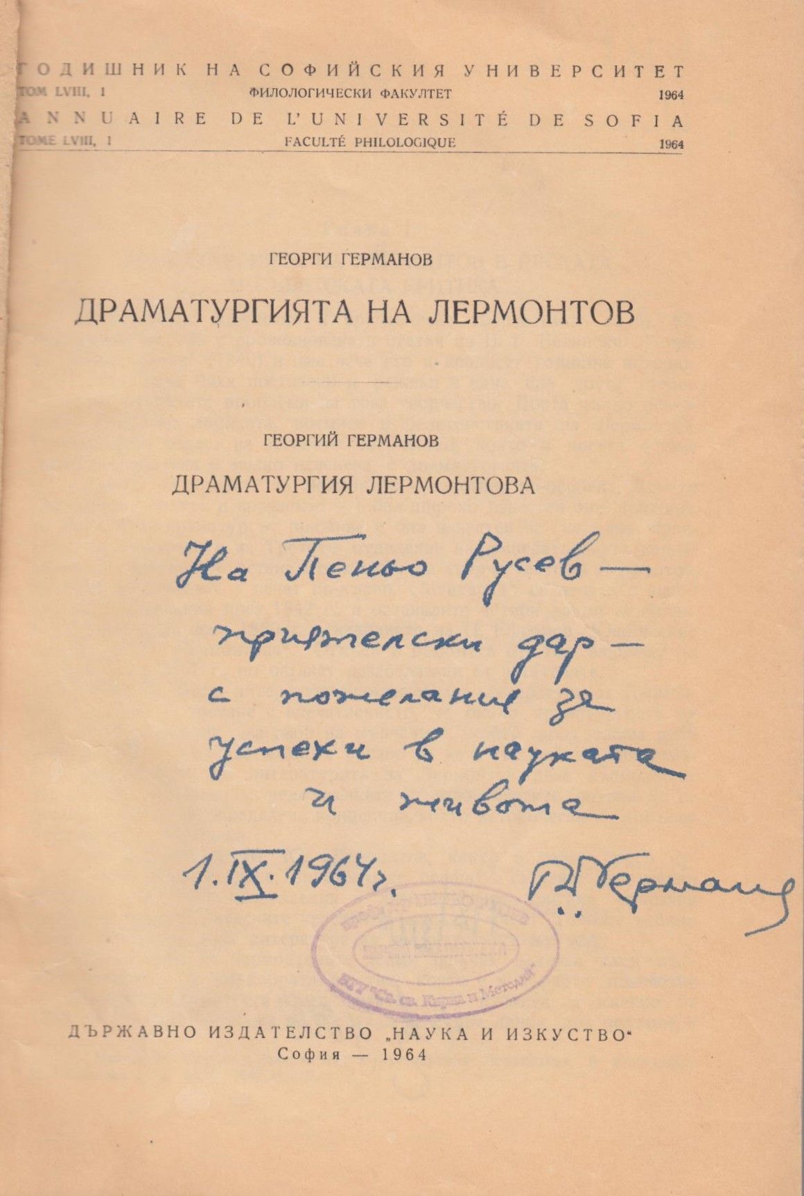 Германов, Георги. Драматургията на Лермонтов / Георги Д. Германов. - София : Наука и изкуство, 1964. - 223 с. ; 24 см. * Заб. Самостоятелно книжно тяло, на корицата са отпечатани данни за Годишник на СУ "Св. К. Охридски", Т. LVII (58), на Филологически факултет (отпечатък)