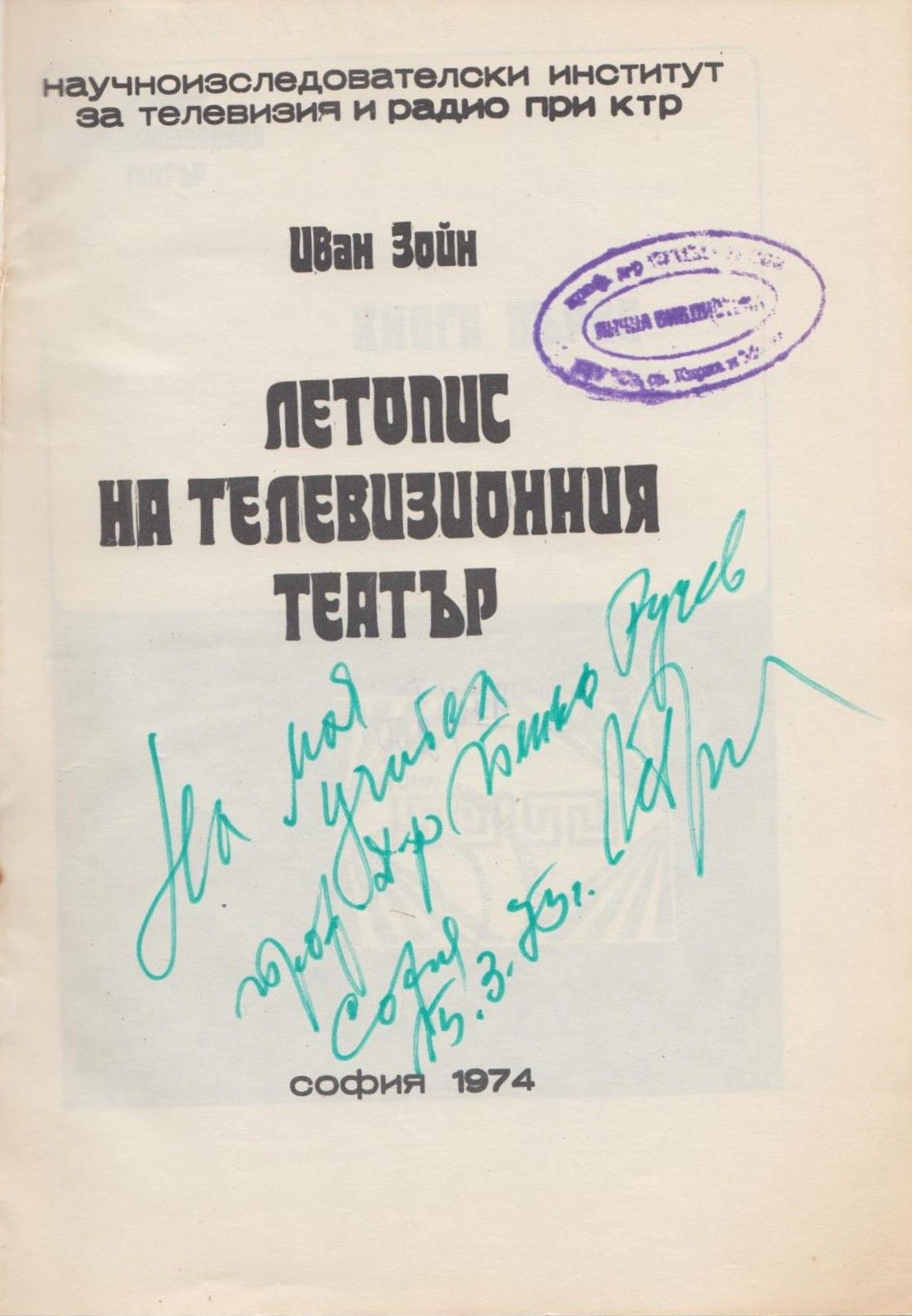 Зойн, Иван. Летопис на телевизионния театър : Кн. 1. / Иван Зойн. – София : НИИТР при КТР, 1974. – 245 с. ; 20 см