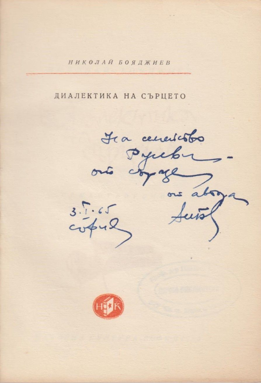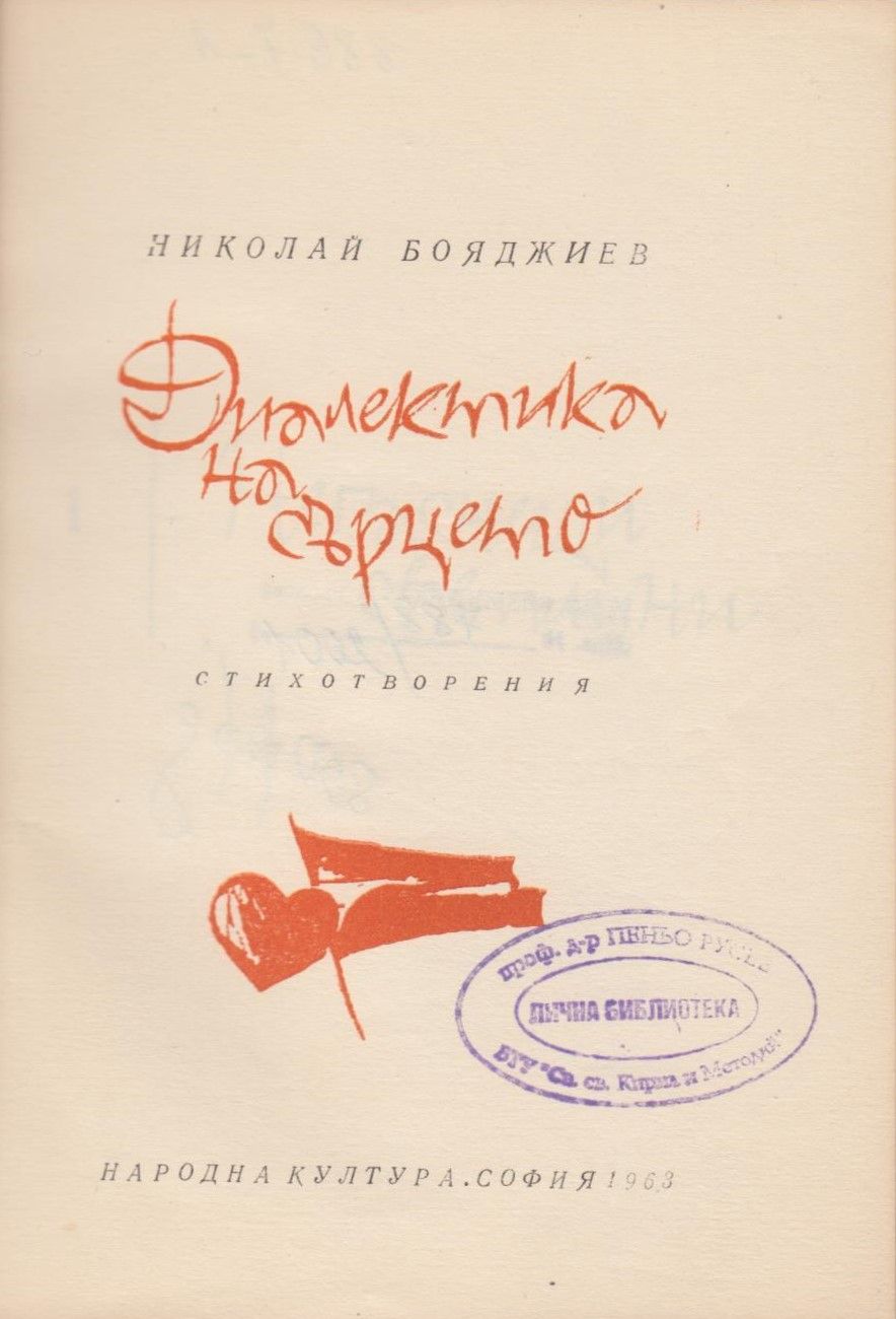 Бояджиев, Николай. Диалектика на сърцето : [Стихотворения] / Николай Бояджиев. - София : Нар. култура, 1963. - 70 с. ; 25 см.