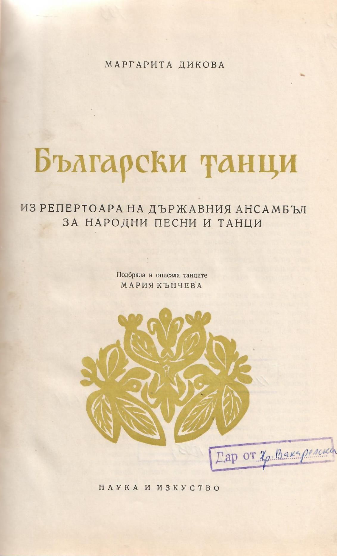 Дикова, Маргарита. Български танци : Из репертоара на Държавен ансамбъл за народни песни и танци / Маргарита Иванова Дикова ; Подб. и описала танците Мария Кънчева. - София : Наука и изкуство, 1961. - 264 с., 12 л. ил. : с ил. и ноти ; 25 см.