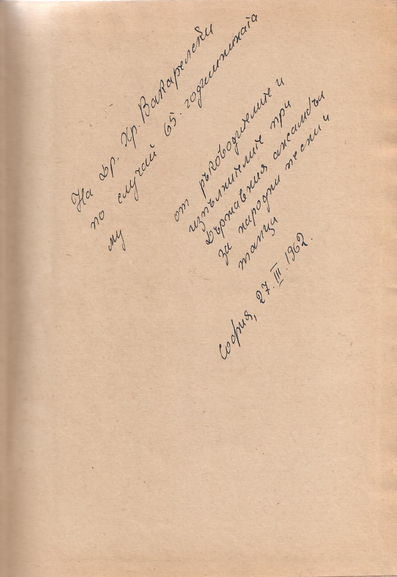Описание : На Др. Хр. Вакарелски по случай 65. годишнината му. От ръководителите и изпълнителите при Държавния ансамбъл за народни песни и танци, София, 27. III. 1962.
