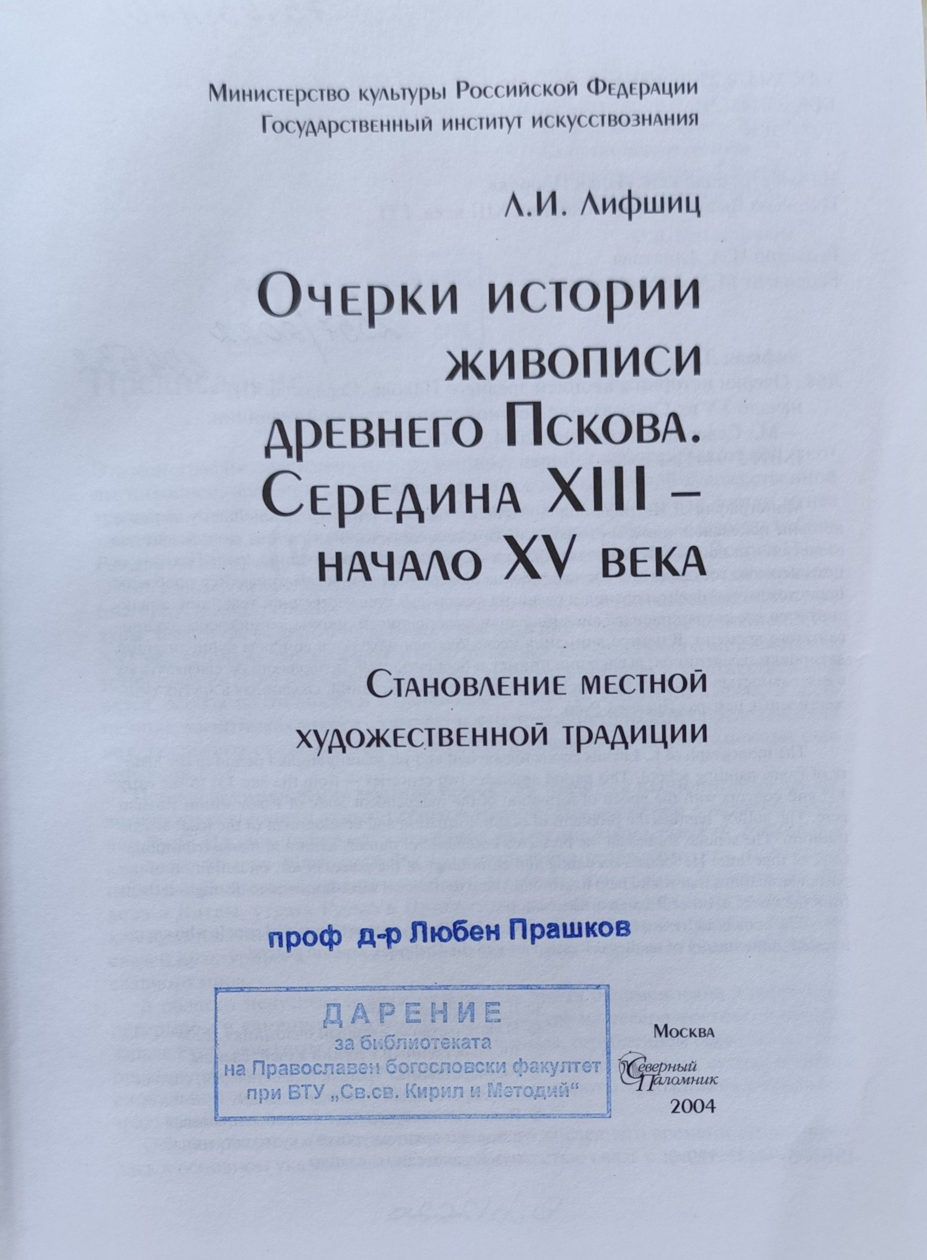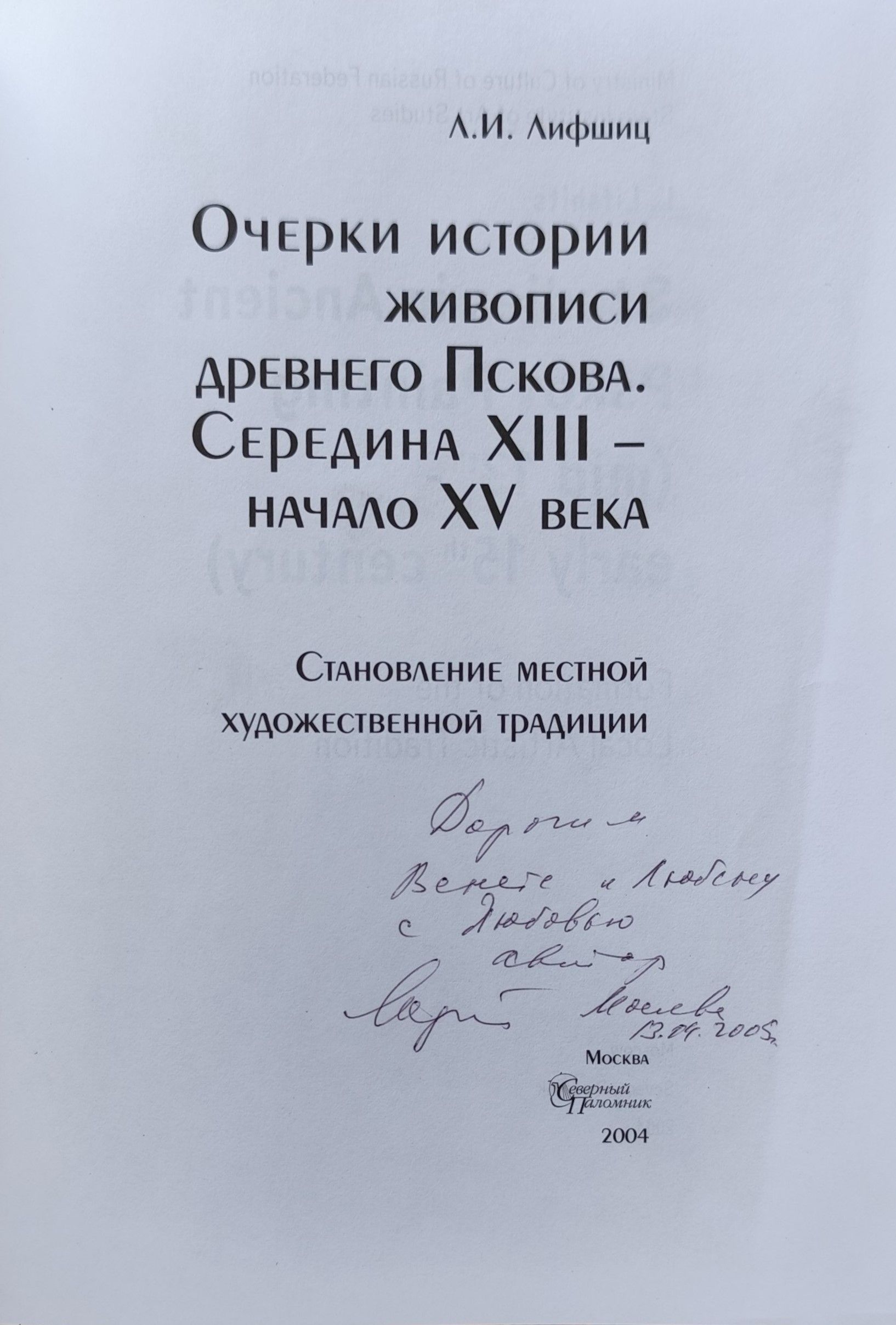 Лифшиц, Л. И. Очерки истории живописи древнего Пскова. Середина XIII - начало XV века : Становление местной художественной традиции / Л. И. Лифшиц . - Москва : Северный Паломник, 2004 . - 504 с.: илл. ; 24 см
