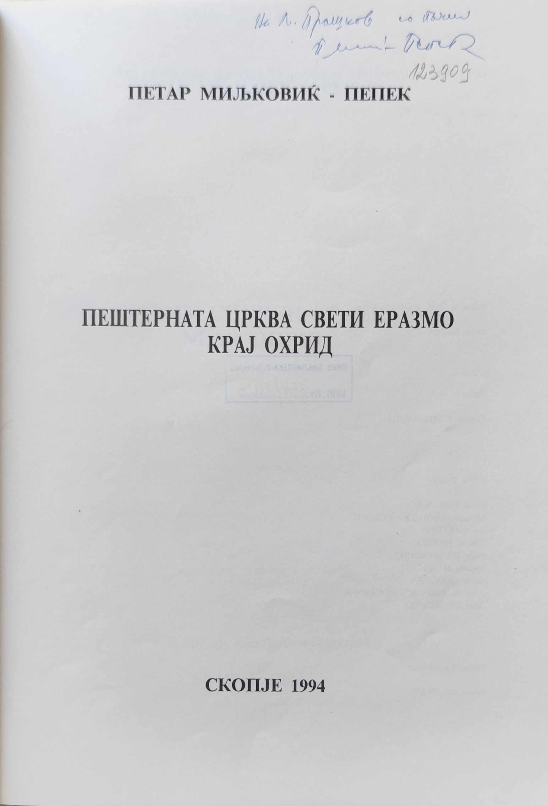 Милкович-Пепек, Петар. Пештерната црква Свети Еразмо краj Охрид / Петар Милкович-Пепек. - Скопjе : Републ. завод за заштита на спомениците на културата, 1994. - 83 с. : с ил. ; 29 см.