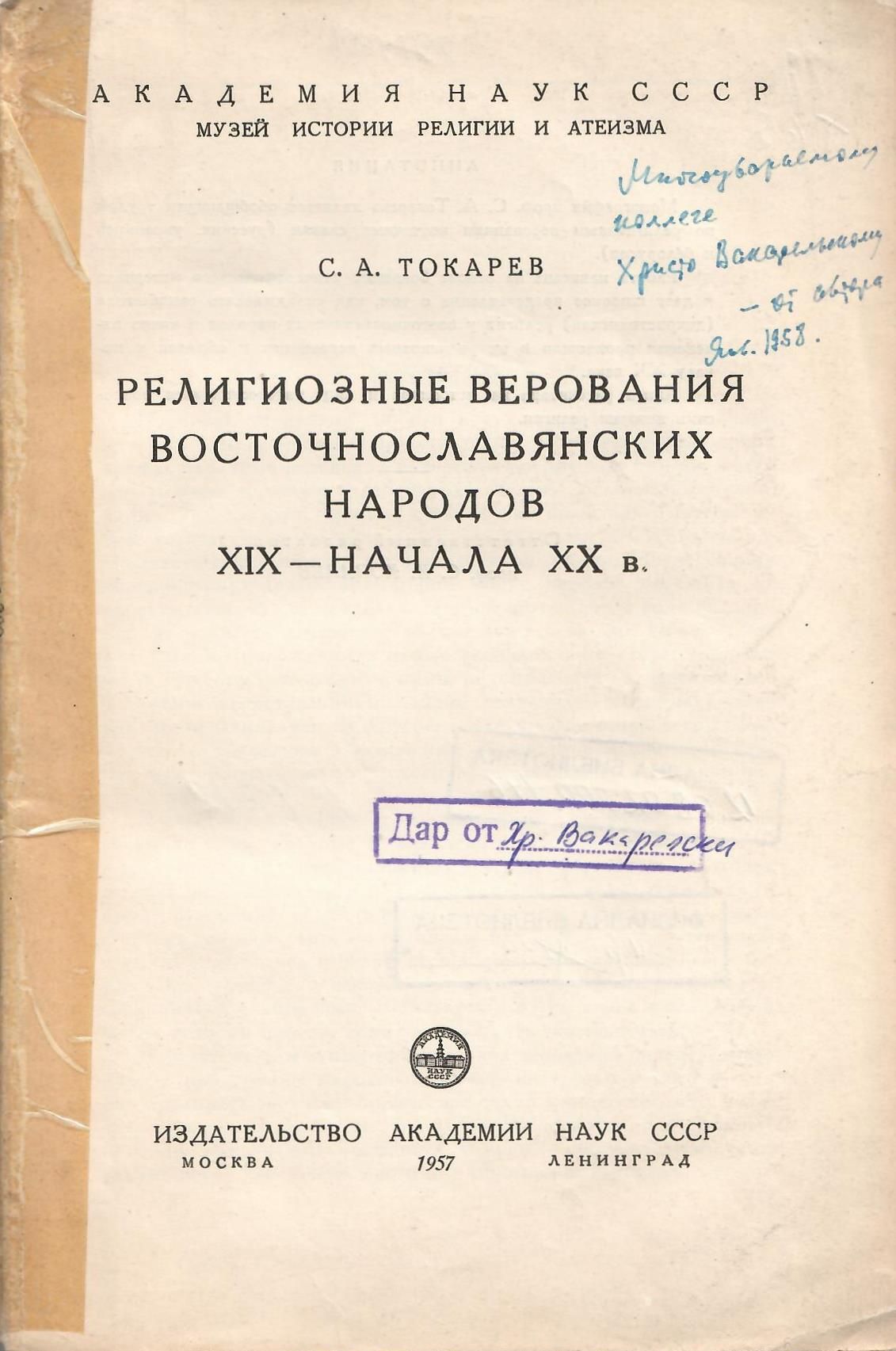 Токарев, Сергей Александрович. Религиозные верования восточно-славянских народов 19-20 века / Сергей А. Токарев. - Москва и др. : АН СССР, 1957. - 164 с. ; 20 см.