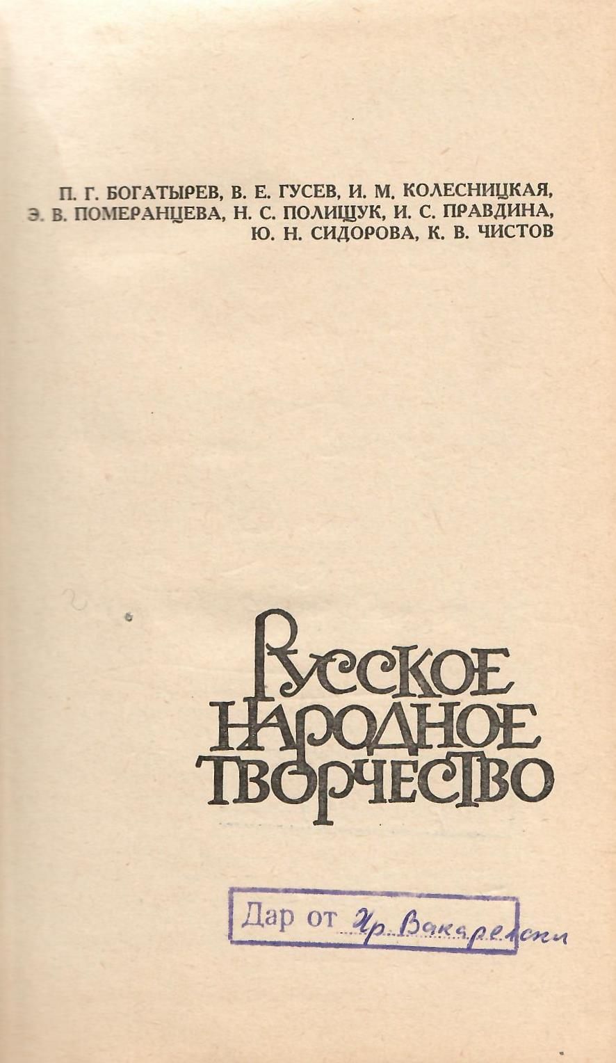 Русское народное поэтическое творчество : Учебное пособие для студентов государственных университетов и педагогических институтов / П. Г. Богатырев и др. - [Москва : Высшая школа, 1966]. - 360 с. ; 22 см.