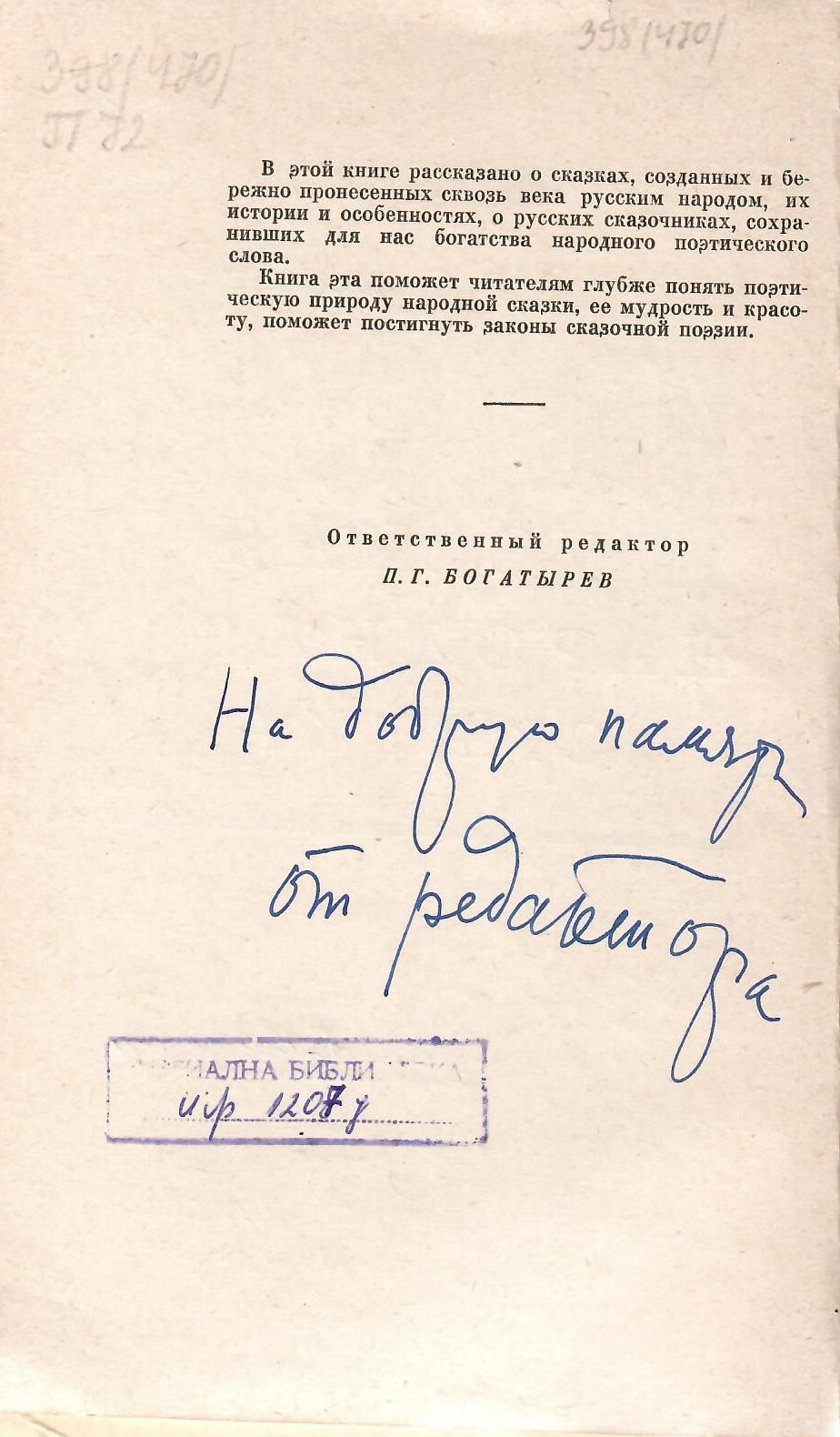 Автор : Саморъчен подпис: Редакторът / П. Г. Богатырев