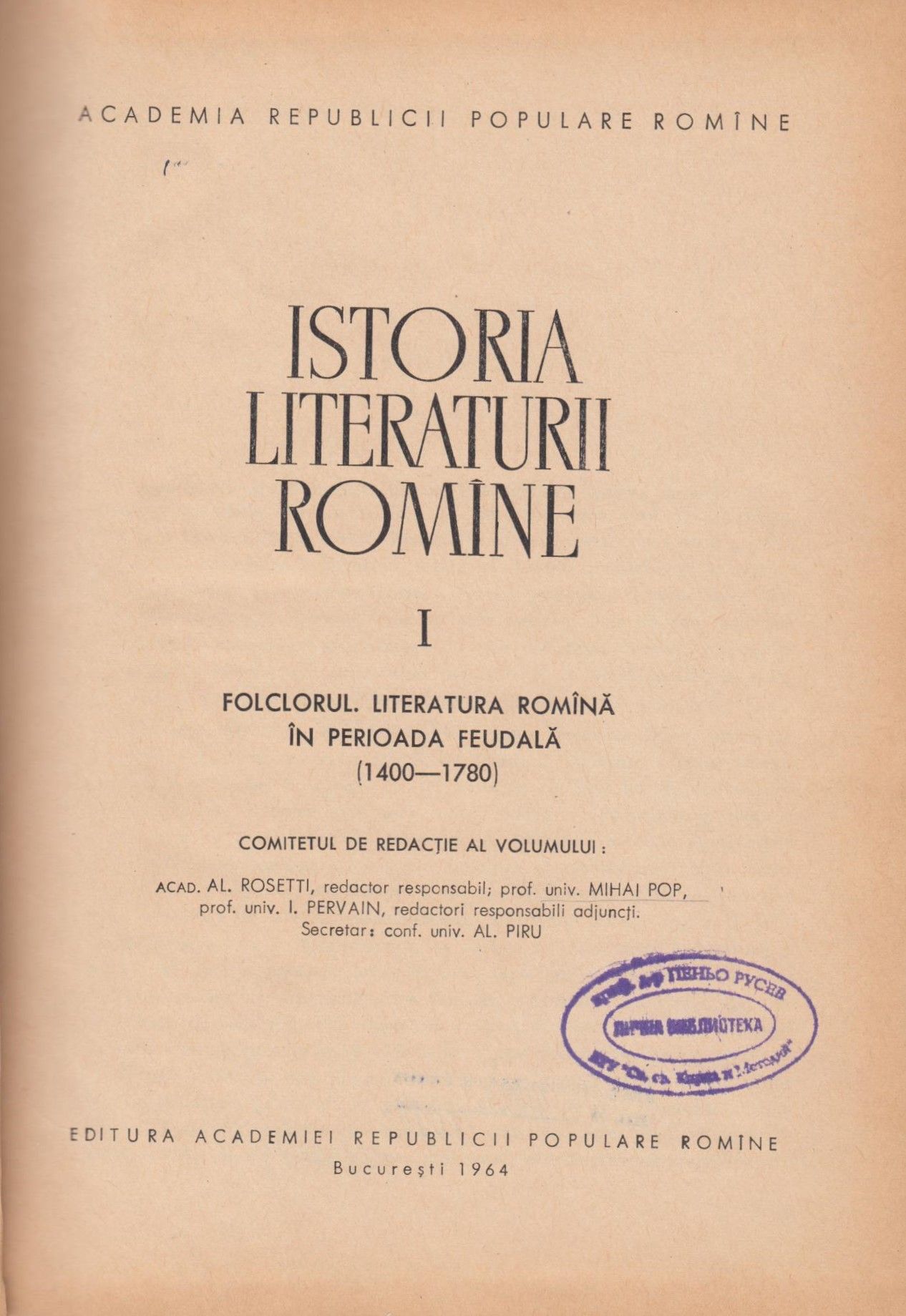 Istoria literaturii romine : Т. 1. Folclorul. Literatura Romina in perioda feudala(1400–1780) / Ред. Al. Rosetti, Mihai Pop, Iosif Pervain. – Bucuresti : Editura Academie Republicii populare Romini, 1964. – 807 p. ; 24 cm:
