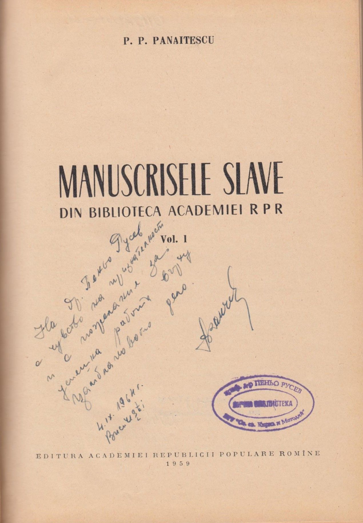 Panaitescu, P. P. Manuscrisele Slave : Din Biblioteca Academiei Rpr / P. P. Panaitescu. – Bucuresti : ARPR, 1959– ; 23 cm T. 1. – 1959. – XX, 406 p.
