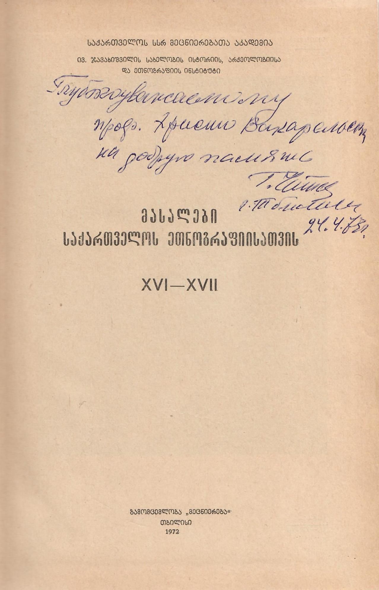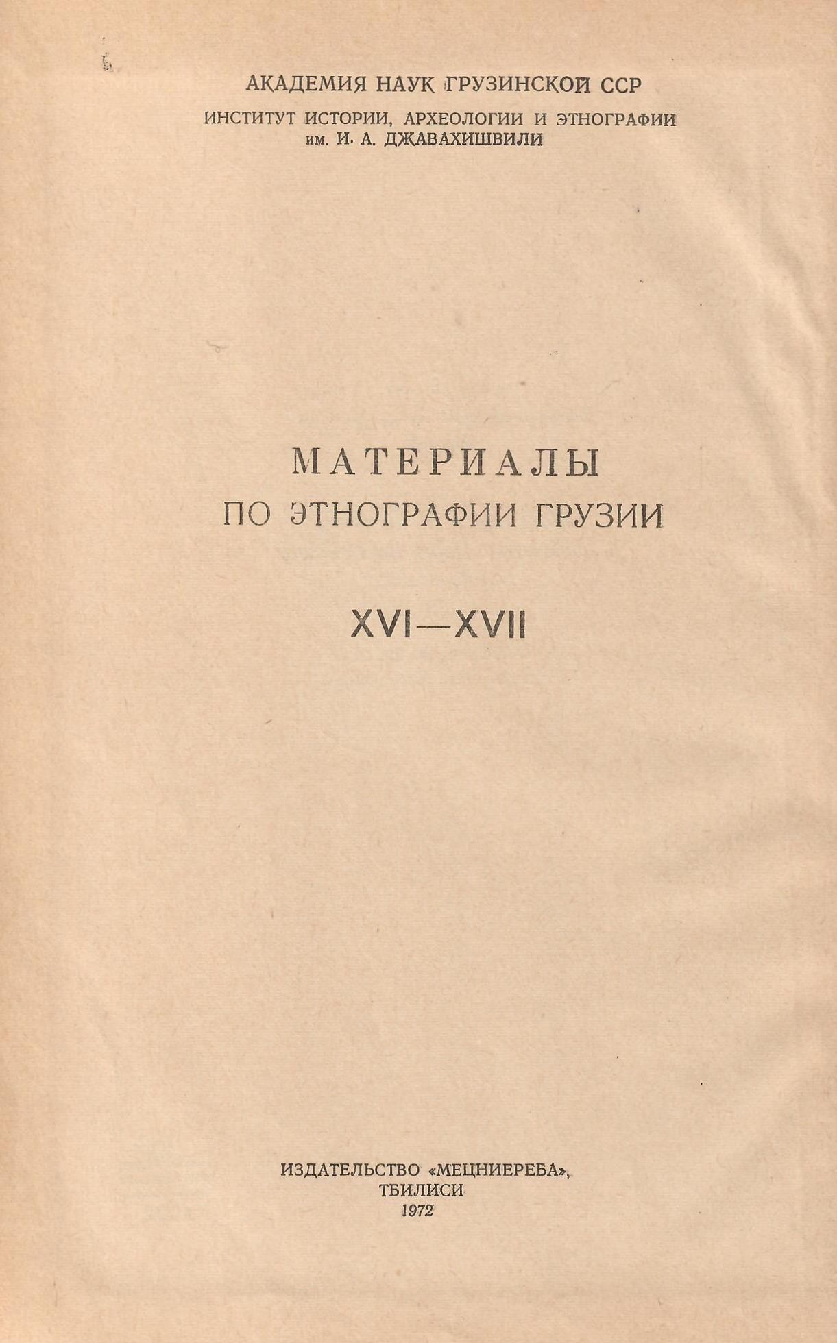 Материалы по этнографии Грузии. XVI—XVII / Академия наук Грузинской ССР, Институт истории, археологии и этнографии им. И. А. Джавахишвили. - Тбилиси : Мецниереба, 1972. (Забележка: Изданието е двуезично – на руски и грузински език)