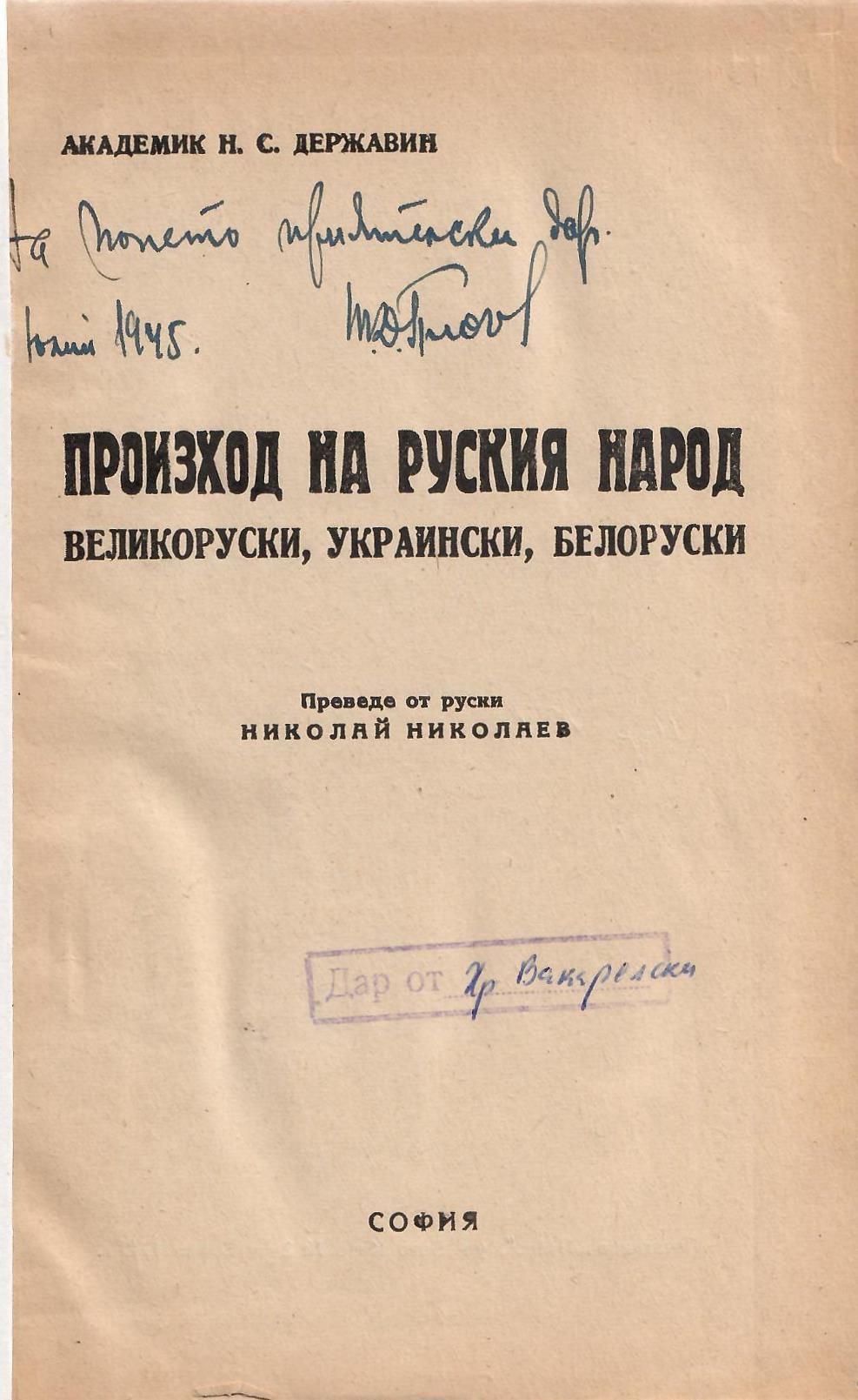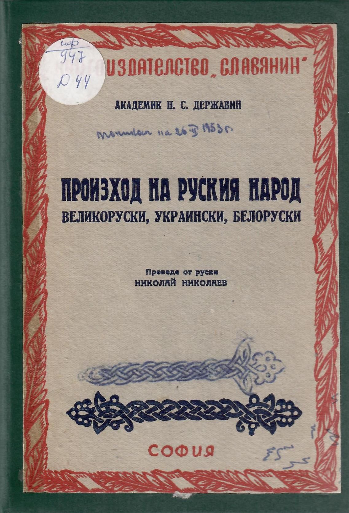 Державин, Н. С. Произход на руския народ : Великоруски, украински, белоруски / Академик Н. С. Державин ; Преведе от руски Николай Николаев. - София : Издателство „Славянин“, 1945 (Печатница „Право“).