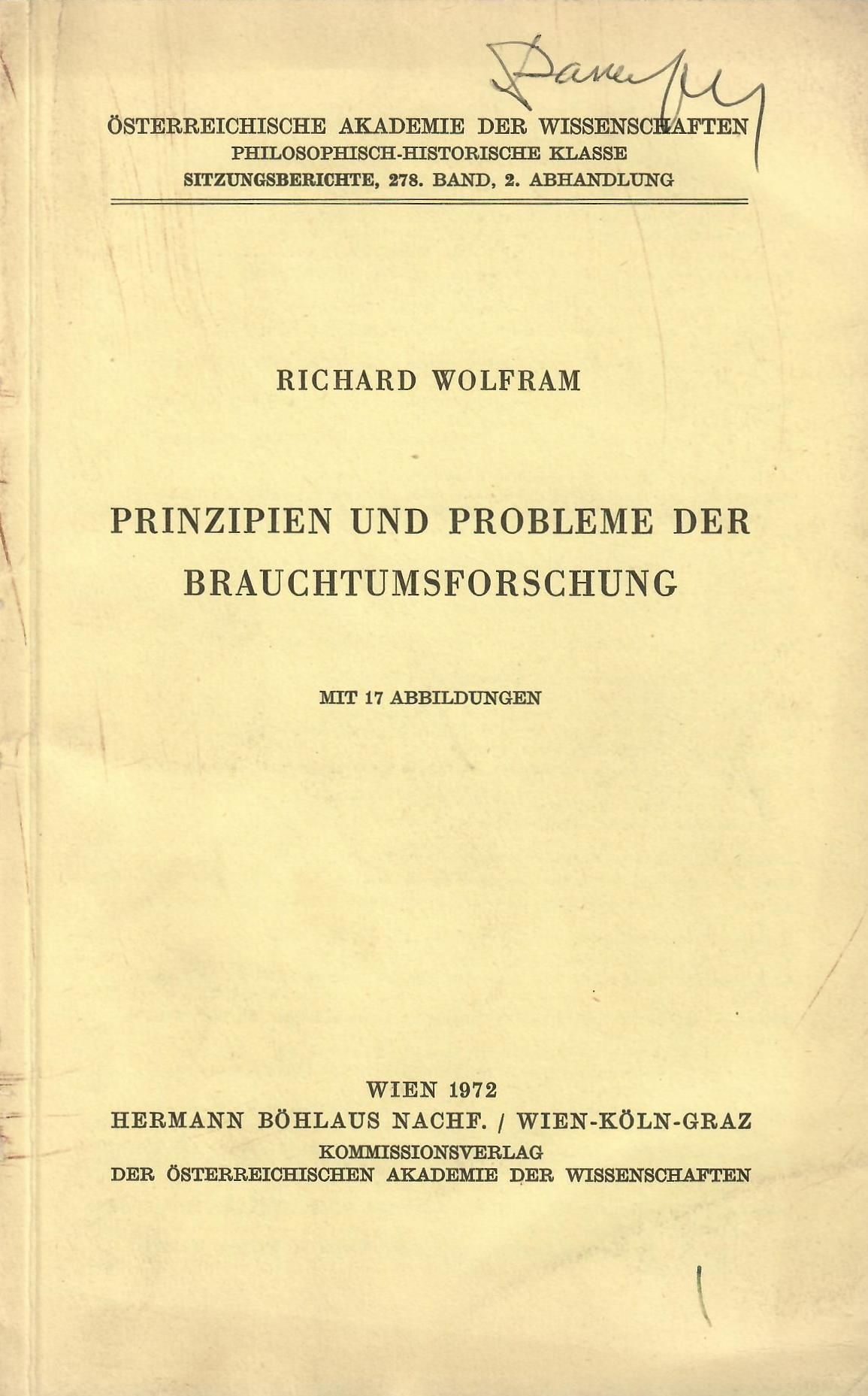 Wolfram, Richard. Prinzipien und Probleme der Brauchtumsforschung : Mit 17 Abbildungen / Richard Wolfram ; Osterreichische Akademie der Wissenschaften, Philosophisch-historische Klasse. - Wien : Hermann Bohlaus Nachf., 1972. - (Sitzungsberichte, 278. Band, 2. Abhandlung).