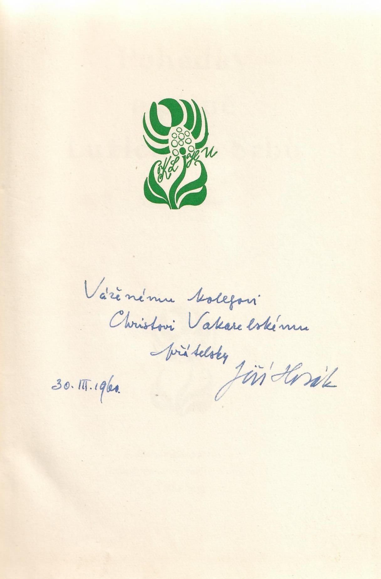 Описание : Издание с дарствен надпис на чешки език: "Vazenemu kolegovi Christovi Vakarelskemu pratelsky Jiri Horak 30. III. 1961." (На уважаемия колега Христо Вакарелски приятелски, Иржи Хорак). Посвещението е от чешкия фолклорист и етнограф Иржи Хорак за българския етнограф проф. Христо Вакарелски. Дигиталният обект е предназначен само за лично ползване.