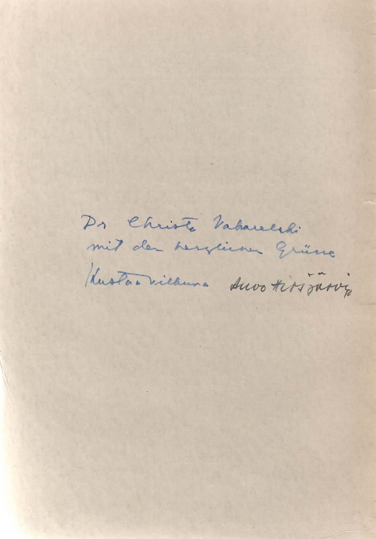 Описание : Екземпляр с дарствен надпис на немски език: "Dr. Christo Vakarelski mit den herzlichen Gru?en Kustaa Vilkuna, Auvo Hirsjarvi" (На д-р Христо Вакарелски с най-сърдечни поздрави от Куста Вилкуна и Ауво Хирсярви). Посвещението е от видните фински етнолози за българския етнограф проф. Христо Вакарелски. Трудът на Манинен е фундаментално изследване върху средствата за придвижване и традиционното облекло. Дигиталният обект е предназначен само за лично ползване.