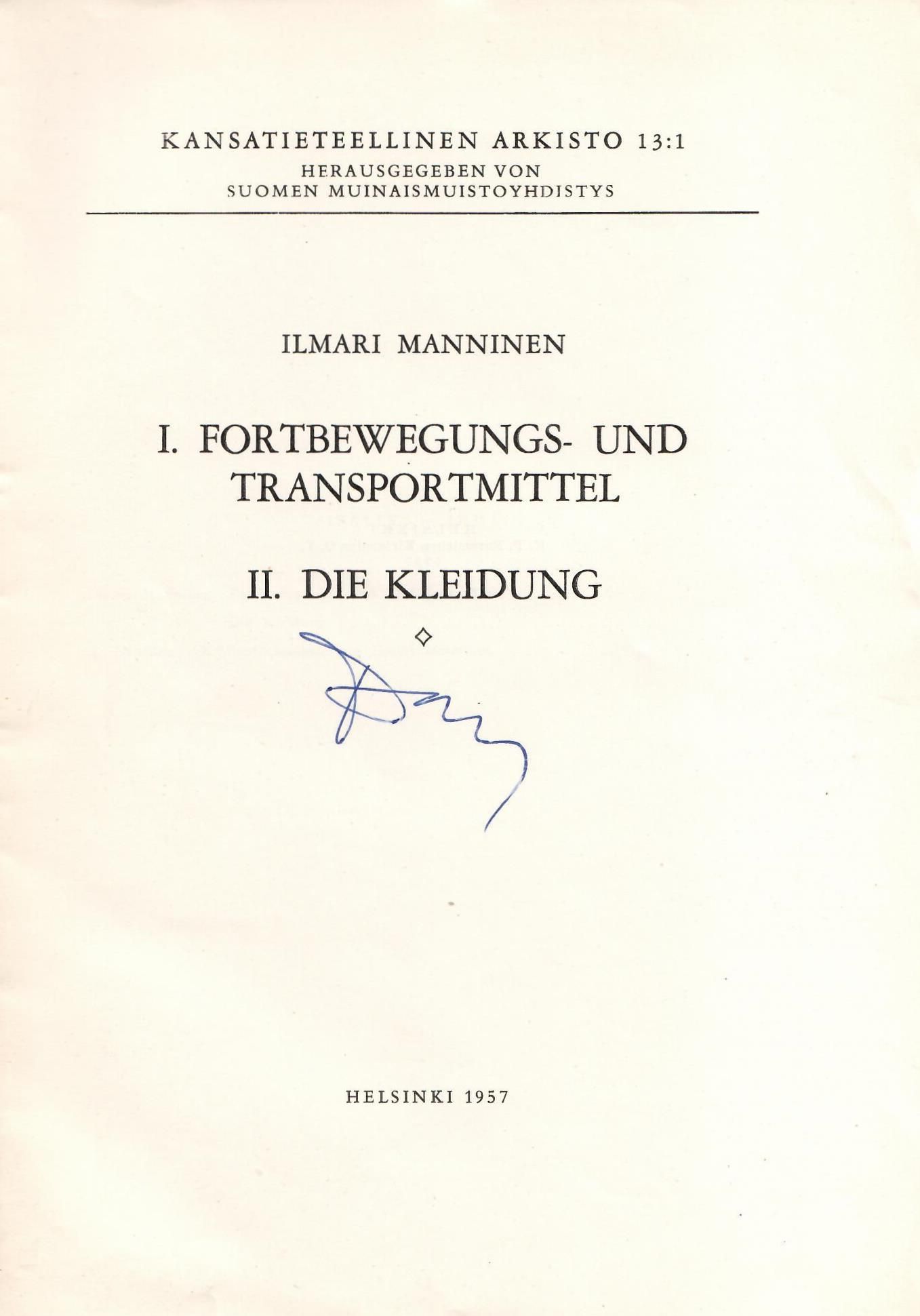 Manninen, Ilmari. I. Fortbewegungs- und Transportmittel ; II. Die Kleidung / Ilmari Manninen. – Helsinki : Suomen Muinaismuistoyhdistys, 1957. – (Kansatieteellinen Arkisto ; 13:1).